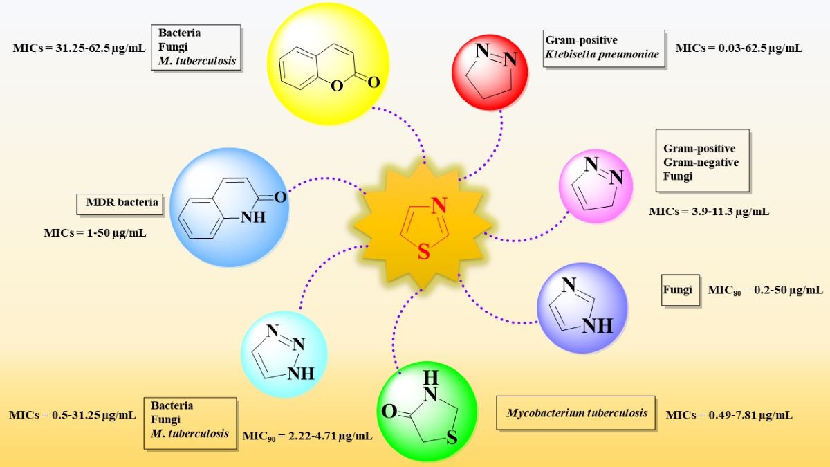 Antimicrobial resistance is an increasing problem for the global public health. One of the strategies to combat this issue is the synthesis of novel antimicrobials through rational drug design based on extensive structure-activity relationship studies. The thiazole nucleus is a prominent feature in the structure of many authorized antimicrobials, being clubbed with different heterocycles. The purpose of this review is to study the structure-activity relationship in antimicrobial thiazoles clubbed with various heterocycles reported in the literature between 2017 and 2022, in order to offer an overview of the last years in terms of antimicrobial research and provide a helpful instrument for future research in the field.