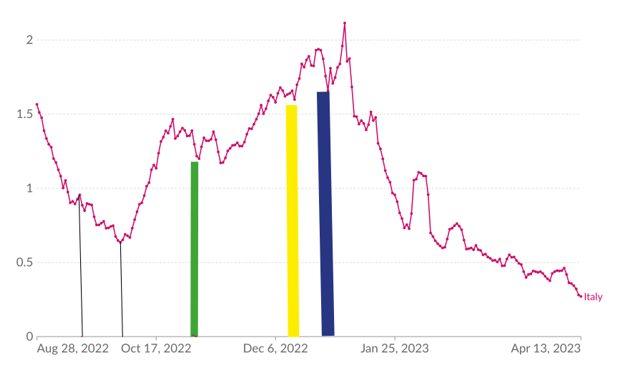 Figure 1 demarcate the period when the schools opened (mid of September – beginning of October, 2022). The green thick bar marks the period when All Saints’/Dead festivities occurred (beginning of November 2022). The yellow thick bar, instead, marks the period corresponding to the Celebration of the Immaculate Conception (December, 8) and finally the blue thick bar delineates the beginning of the period of the Christmas and New Year festivities. The curve also shows, very clearly, all the increasing and decreasing trends we have described before. The curve represented in