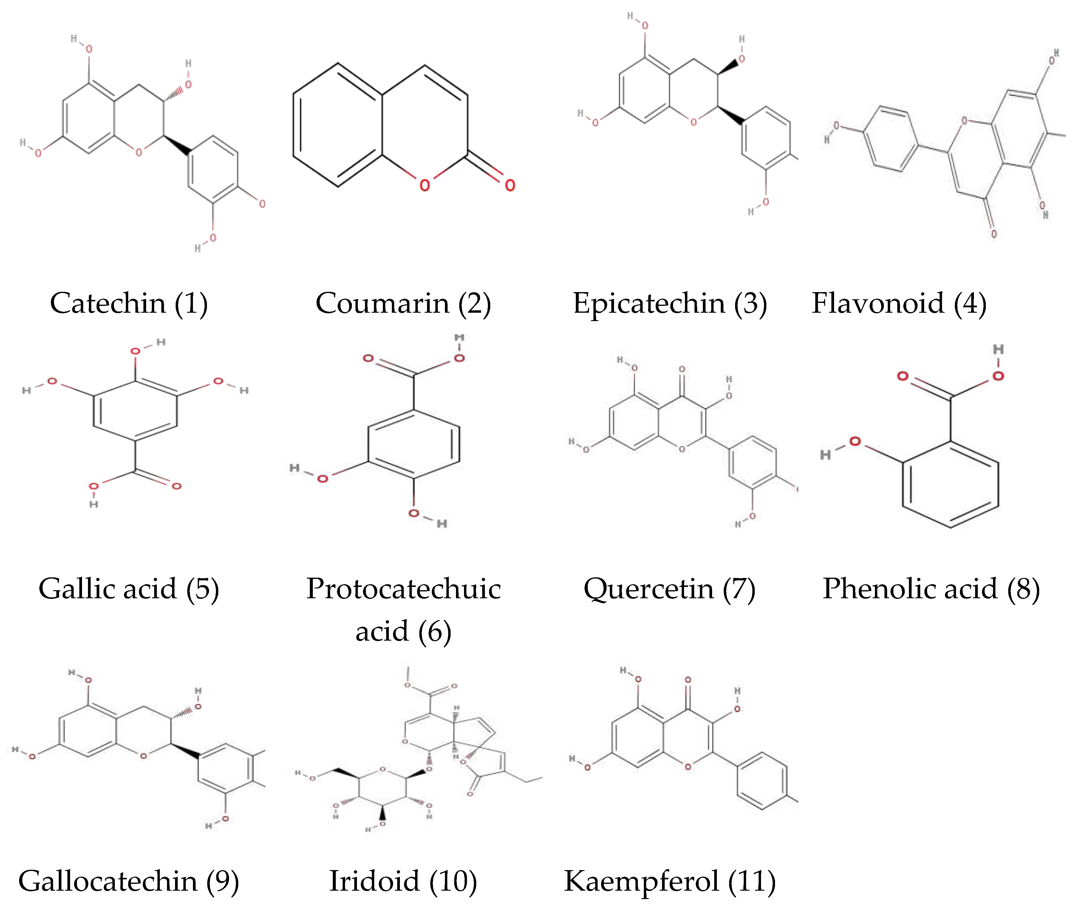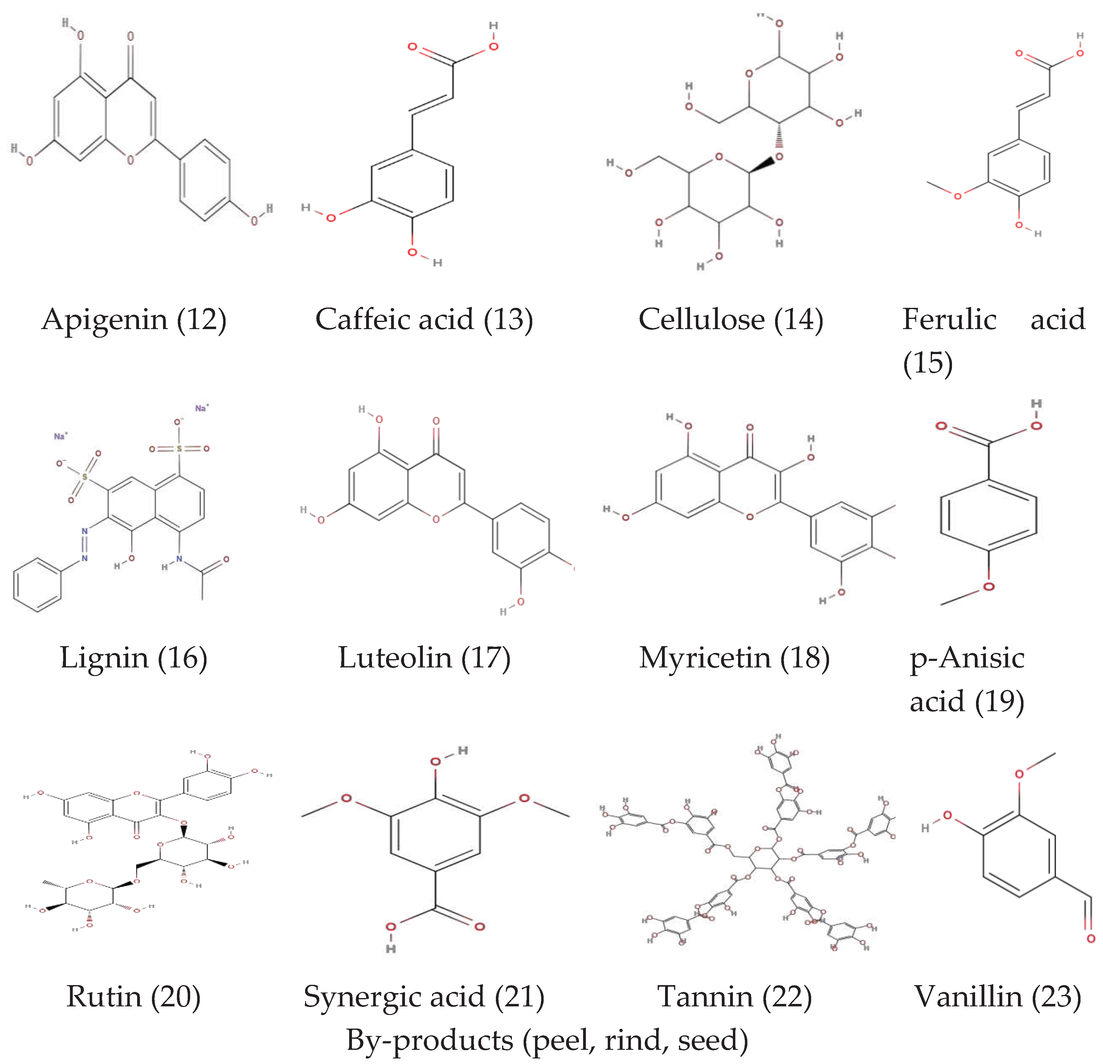 Gallic acid, Caggeic acid, Syringic acid, Sinapic acid, Rosmarinic acid, Vanillic acid, Prochatechuic acid, Leuteolin, Flavonoids, Flavone, Chlorogenic acid, Apigenin, Phenolic acid, 4-hydroxybenzoic acid, Ferulic acid, Coumaric acid. |