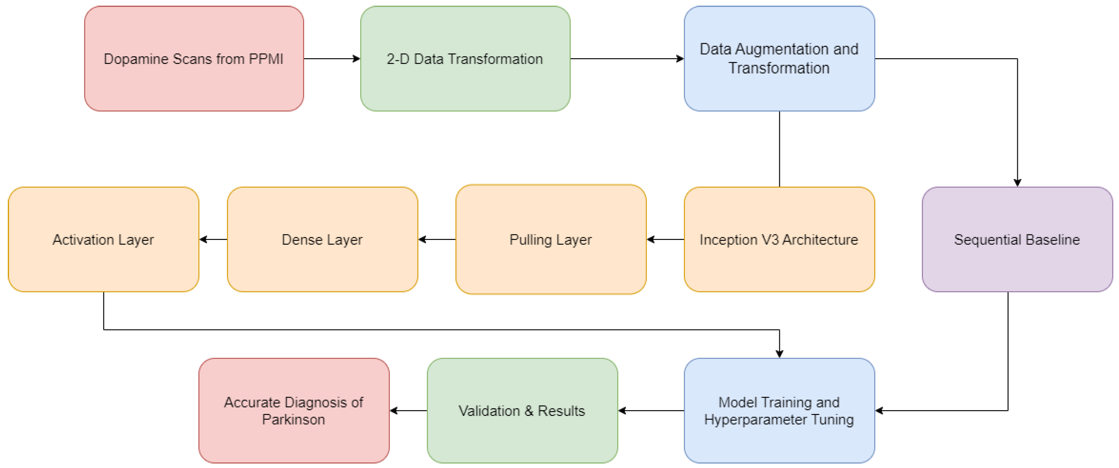 Demir et al. 2019). When applied to the analysis of SPECT DaTSCAN images, InceptionV3 can leverage its pre-trained weights as a starting point, which can then be fine-tuned to recognize patterns specific to PD. This process, known as transfer learning, is particularly advantageous when dealing with medical datasets that are often smaller than the datasets typically used to train deep learning models from scratch (