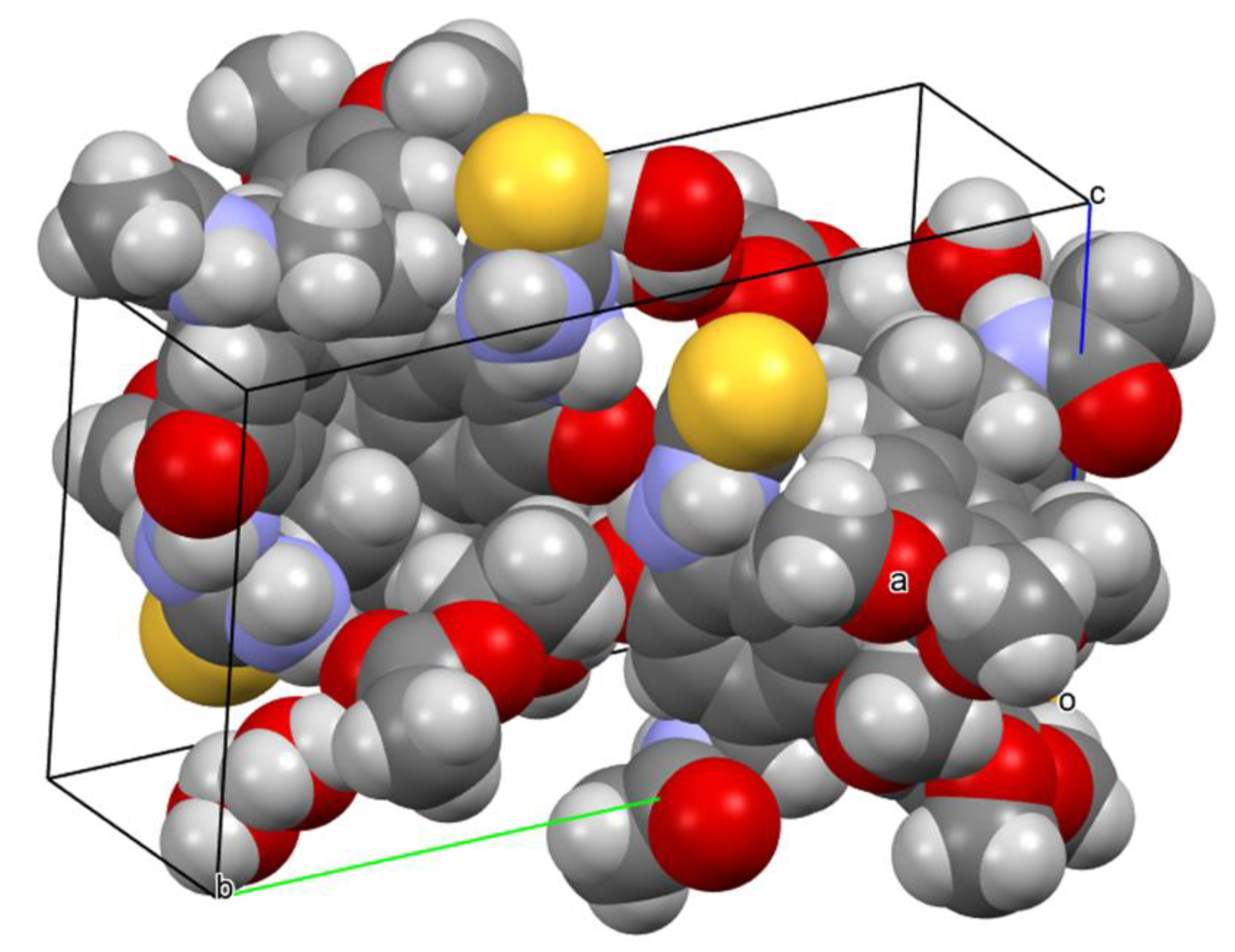 4.3. X-Ray Crystallographic Determination of the Crystal and Molecular Structure of (M)-10-(2-Carbamothioylhydrazinyl)-10-demethoxycolchicine Sesquihydrate × ½ (Ethyl Acetate) = N-[(aS,7S)-10-(2-Carbamothioylhydrazinyl)-1,2,3-trimethoxy-9-oxo-5,6,7,9-tetrahydrobenzo[a]heptalen-7-yl]acetamide Sesquihydrate × ½ (Ethyl Acetate) (Crystalline Compound 2)