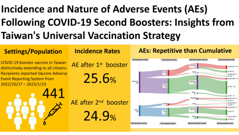 The primary objective of this study is to investigate the incidence rates of adverse events (AEs) following the administration of the second booster dose (fourth dose) of the COVID-19 vaccine. Taiwan boasts high vaccination rates globally (first dose coverage at 93.8%, second at 89.06%, third at 76.9%, and fourth at 25%) and encourages booster vaccinations for the entire population in contrast to the strategies of other countries that focus primarily on high-risk groups.[
