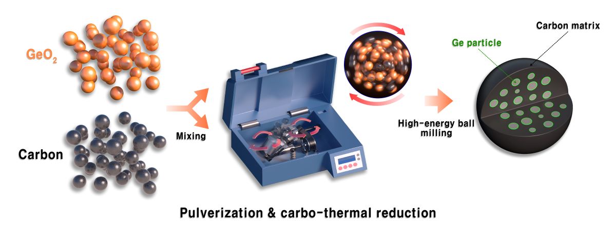 2-C composite material production scheme using the simple HEBM technique. Owing to the high malleability of alloy metals (Ge, Pb, Sn, Si, etc.), size control cannot be achieved by directly milling the material. To obtain mechanically well-pulverized particles, bulk GeO