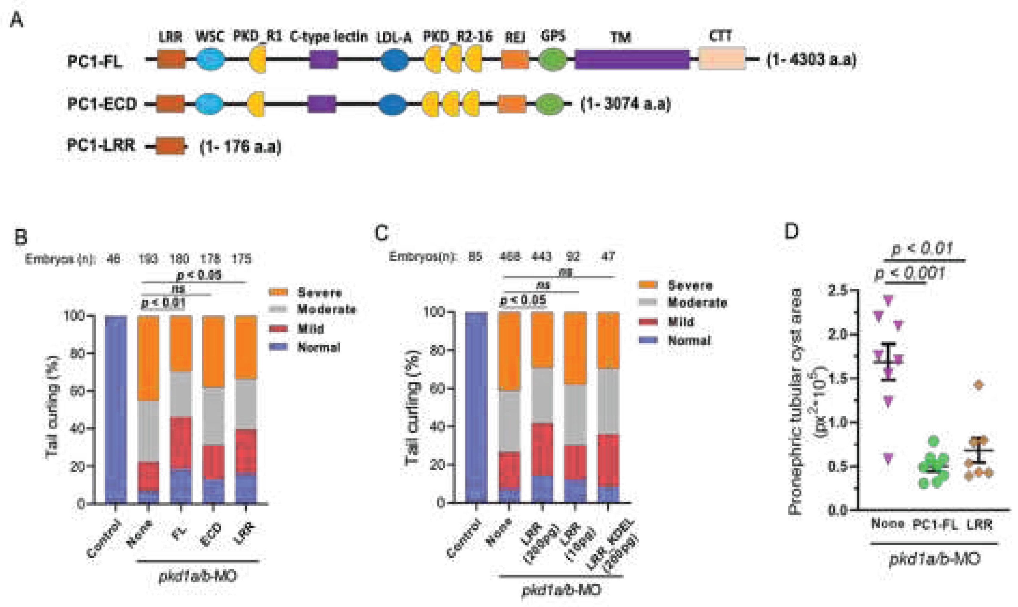 In the current study we explored the role of ECD of PC1 in the development of kidney cysts in ADPKD using a zebrafish model. We found that the entire ECD not capable of substituting the effect of full-length PC1 to reverse PC1-deficient phenotypes in zebrafish. Interestingly, the LRR domain in the absence of rest of ECD is capable of reversing PC1-deficiency when it is overexpressed. The effects of LRR are demonstrated by reversal of dorsal axis curvature and pronephric cystic area, both well-characterized to represent PC1 function in zebrafish. The effect of LRR acting from the extracellular space is supported by the finding that ER-targeted LRR (LRR_KDEL,