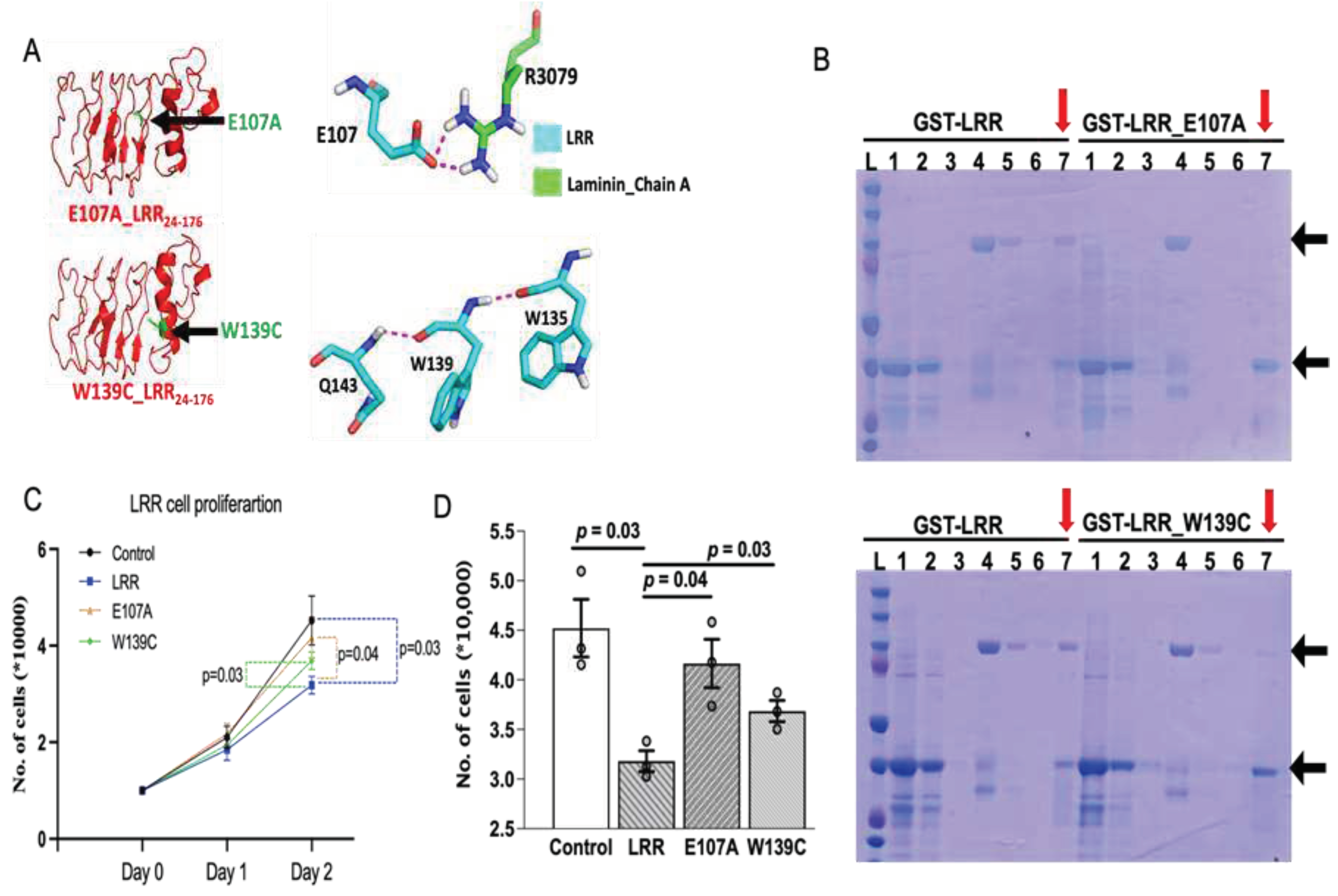 Effects of GST-LRR on the proliferation efficiency of HEK cells were studied using the freshly purified GST-LRR at varying concentrations (10, 30, 100, and 300 ng/mL). HEK cells were grown in Dulbecco’s Modified Eagle Medium (DMEM) as described above. Cell proliferation efficiency was measured by an automatic cell counter (Bio-Rad) for Days 0, 1, 2, and 3. The experiment was performed in a 24-well plate with complete (media + 10% FBS) and incomplete (media only). To harvest the cells, media was aspirated, and cells were washed with PBS. Trypsin (0.05%, 200 ul, Gibco) was added in each target well and incubated it for 5 minutes at room temperature before adding complete DMEM (800 ul) to neutralize the trypsin. Cell counting was performed by mixing 20 ul of the harvested cells with 20 ul of trypan blue. Same protocol was followed for Days 0, 1, and 2 for the effects of E107A and W139C on HEK cells proliferation as well.