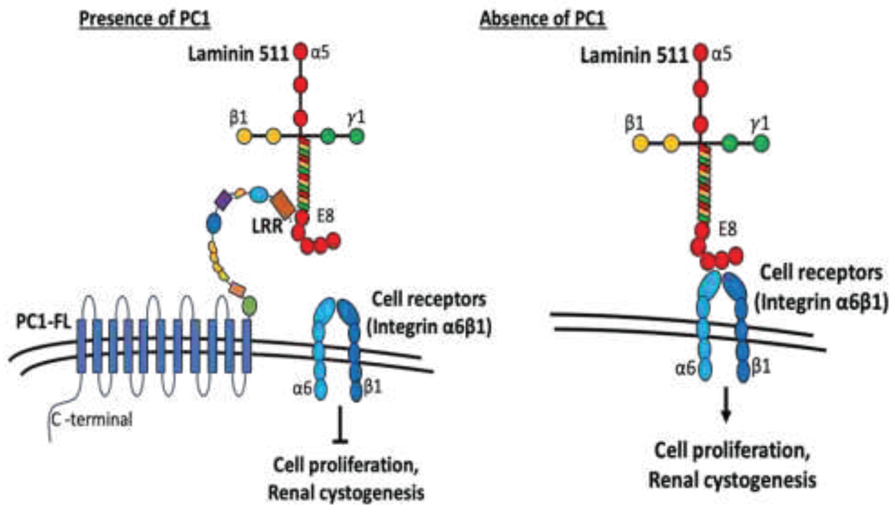 Working model depicting the role of LRR in modulating cell proliferation and cystogenesis. Current work suggests the role of PC1 as a modulator of ECM components. N-terminal extracellular fragment of PC1 contains multiple domains similar to various adhesion proteins that are involved in cell-cell and cell-matrix contacts. LRR domains in PC1 interacts with laminin 511 and inhibits its interaction with cell surface receptors integrin α6ß1. Without PC1, laminin-511 interacts with integrin α6ß1 to trigger downstream signaling cascades promoting cell proliferation and renal cystogenesis. See text for more details.