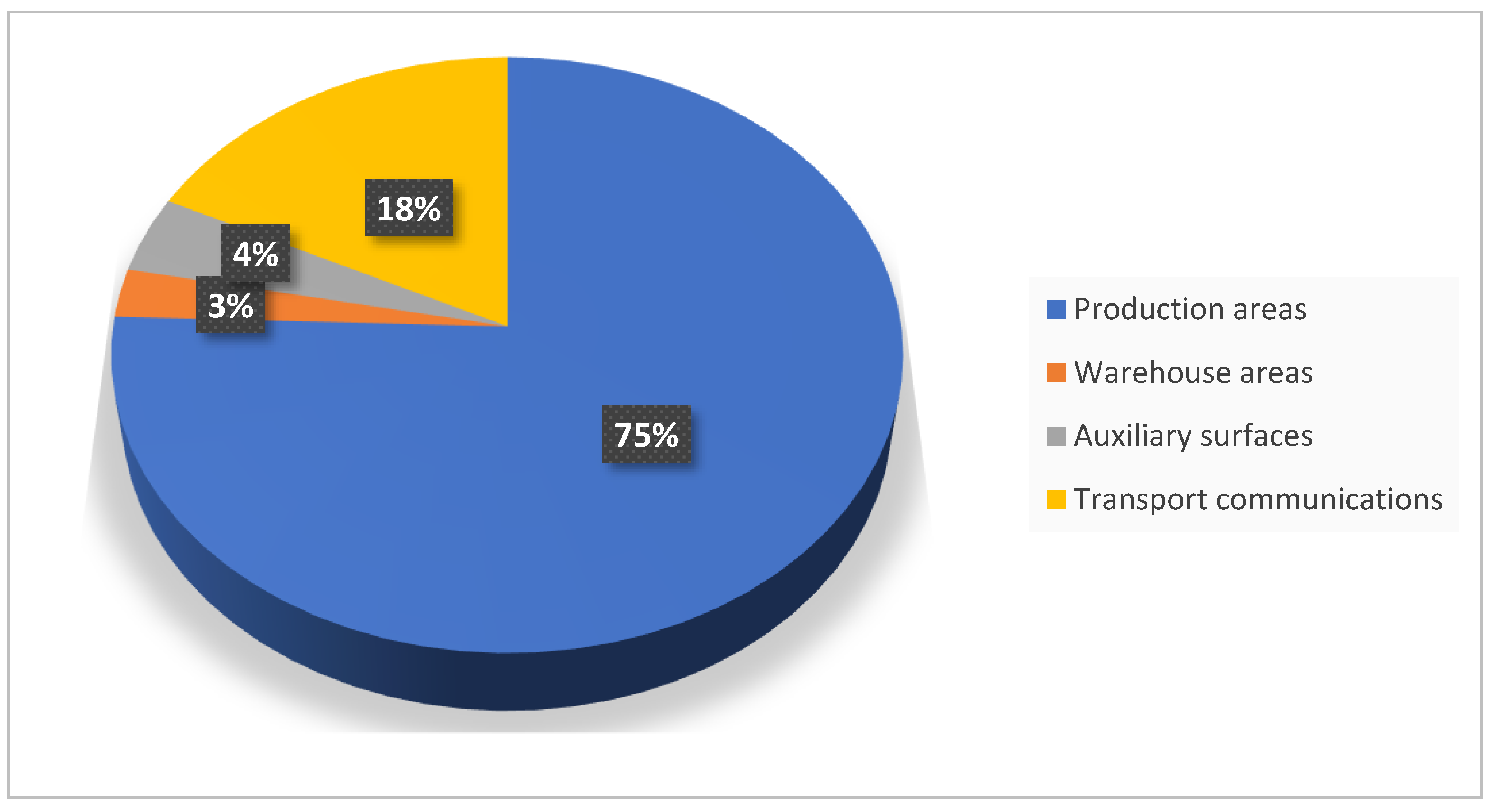 Figure 3 that the production areas occupy 75% of the total areas of the enterprise. Transport communication occupies 18% of the total areas of the enterprise, auxiliary areas occupy 4% of the total areas of the enterprise, and only 3% of the total areas are occupied by warehouse areas. From the area ratio in %, the company uses its areas as production areas as much as possible.