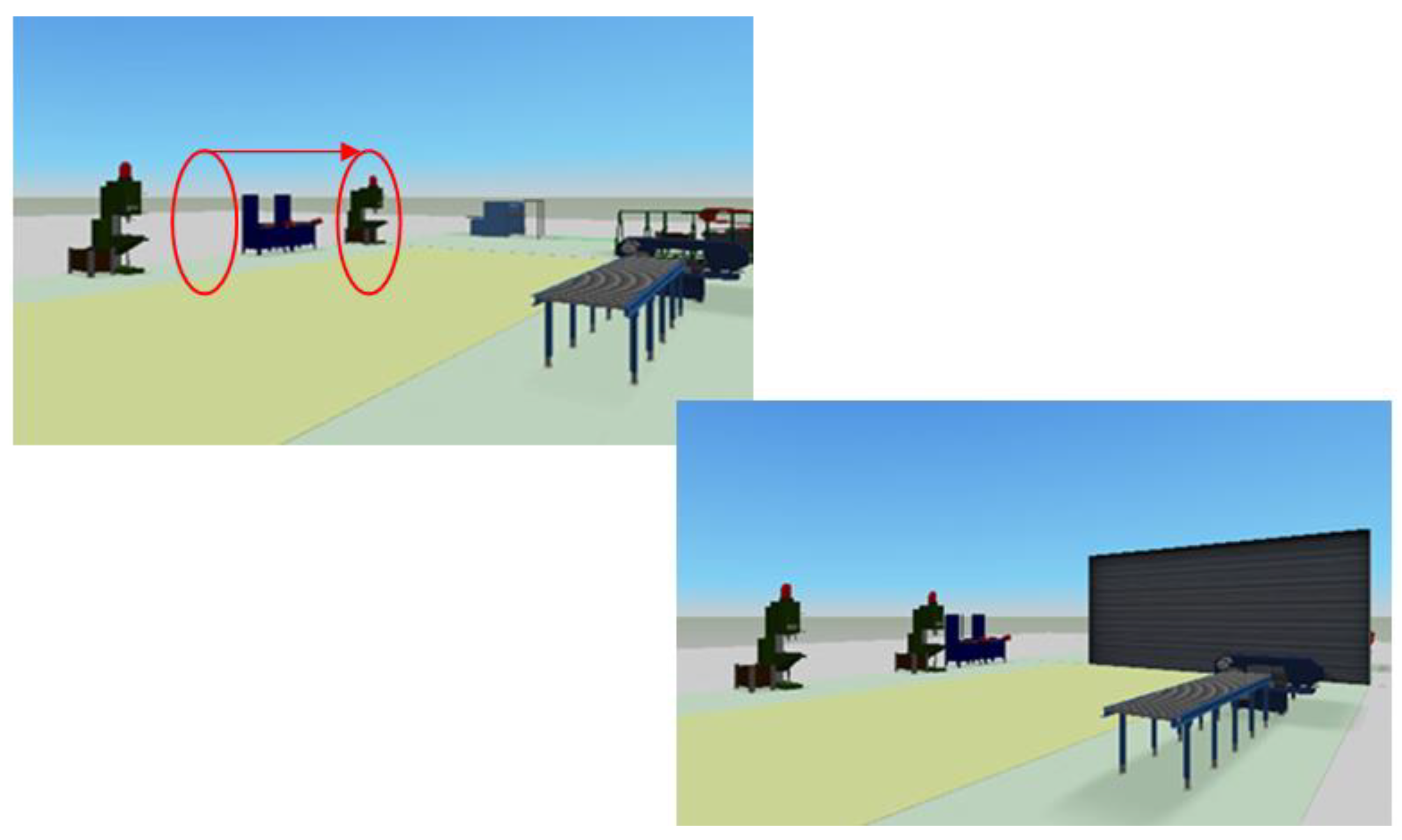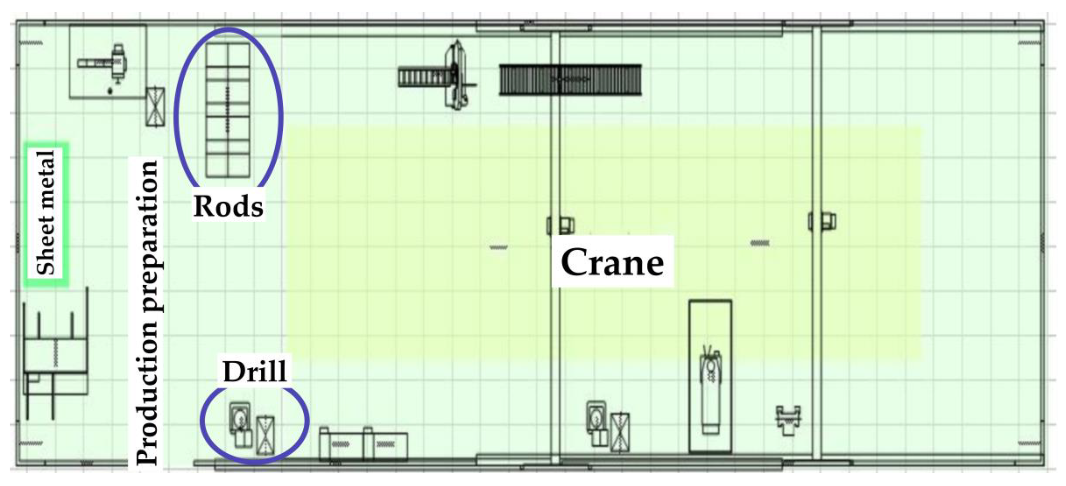 Figure 2, in the left part of the picture, the production preparation is taking place. In addition, in this part, there are material and individual machines, that are necessary for the production process itself. In this part, some rods are divided using a band saw. A slewing crane with a Hoist Groove is also located in this area. In the lower part, there is a door, and, in this part, it is possible to see sheets that are cut using scissors. In the middle part of the picture, you can see the production hall, where production processes occur. In the upper part is a band saw and a roller conveyor. In the lower part, there are two stand drills with a worktable and then a grinder. There are cranes, which are necessary for handling the material. A sheet metal bender can be seen in the right part of the picture.