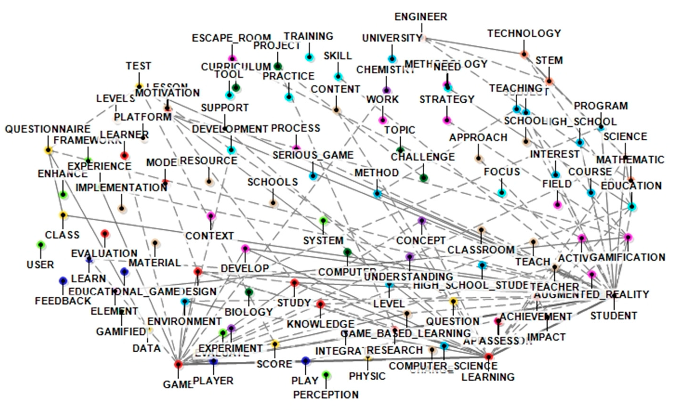 The early stage of the analysis involved viewing the text to remove irrelevant lemmas, such as numerical values or proper names of games. Following this, some key steps were performed: applying an automatic list of “stop worlds” (i.e., “empty” words that do not convey meanings by themselves; e.g., adverbs, auxiliary and modal verbs, and prepositions); creating a list of “multi- words” (i.e., subsets of compound nouns or locutions; e.g., “Game- Based Learning”, “Virtual Reality”, “Educational Games”); grouping words and lemmas with the same meaning (e.g., “GBL”, and “Game- Based Learning”, “AR” and “Augmented Reality”); selecting for further analysis as “key words” only those lemmas with an occurrence in the whole corpus greater than 10; removing additional items among the identified keywords that did not convey particular meanings of interest to the study (e.g., “results”, “statistical”, “aim”, “finding”).