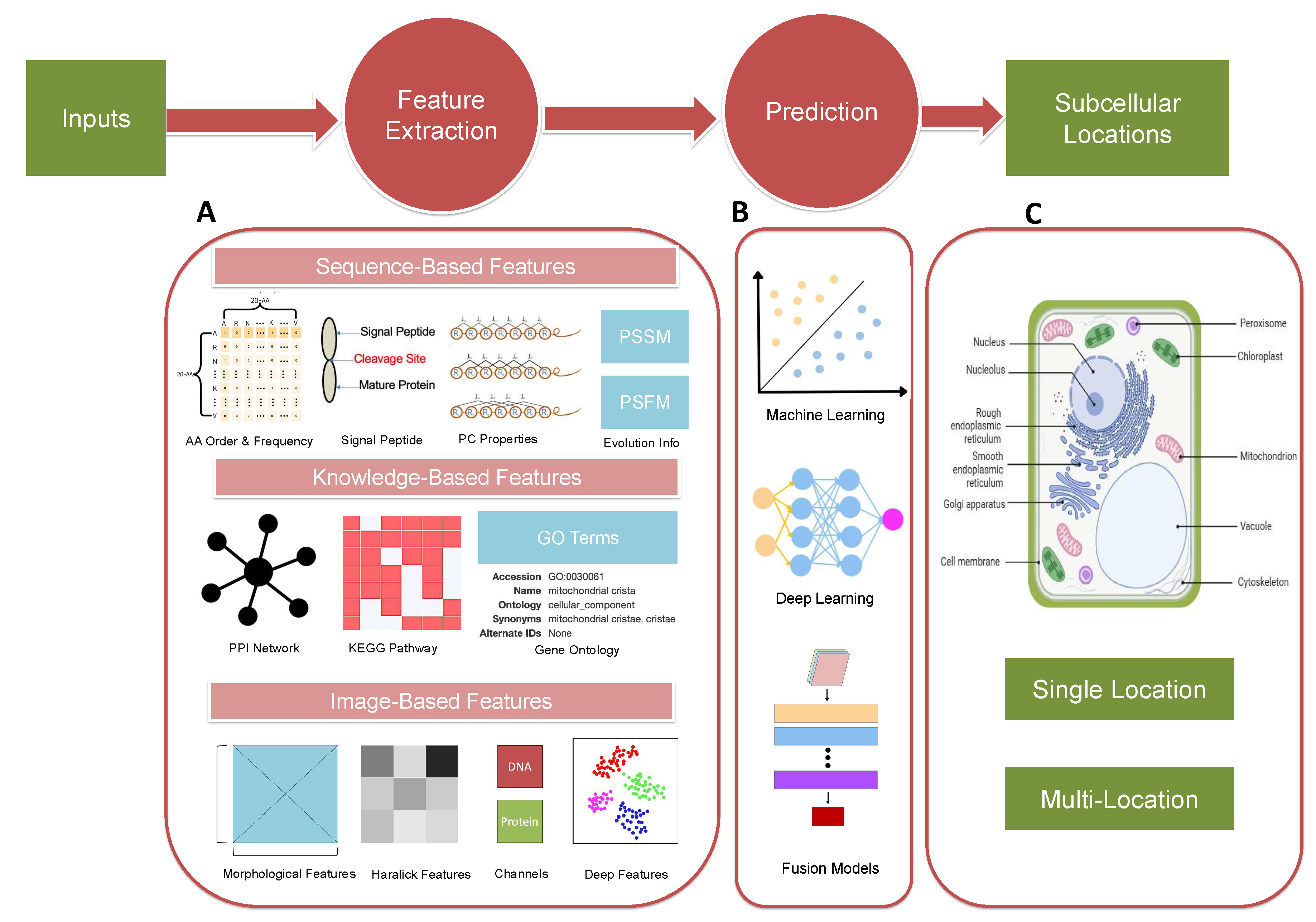 - Xu, Y.-Y.; Yao, L.-X.; Shen, H.-B. Bioimage-Based Protein Subcellular Location Prediction: A Comprehensive Review. Front. Comput. Sci. 2018, 12, 26–39. [Google Scholar] [CrossRef]