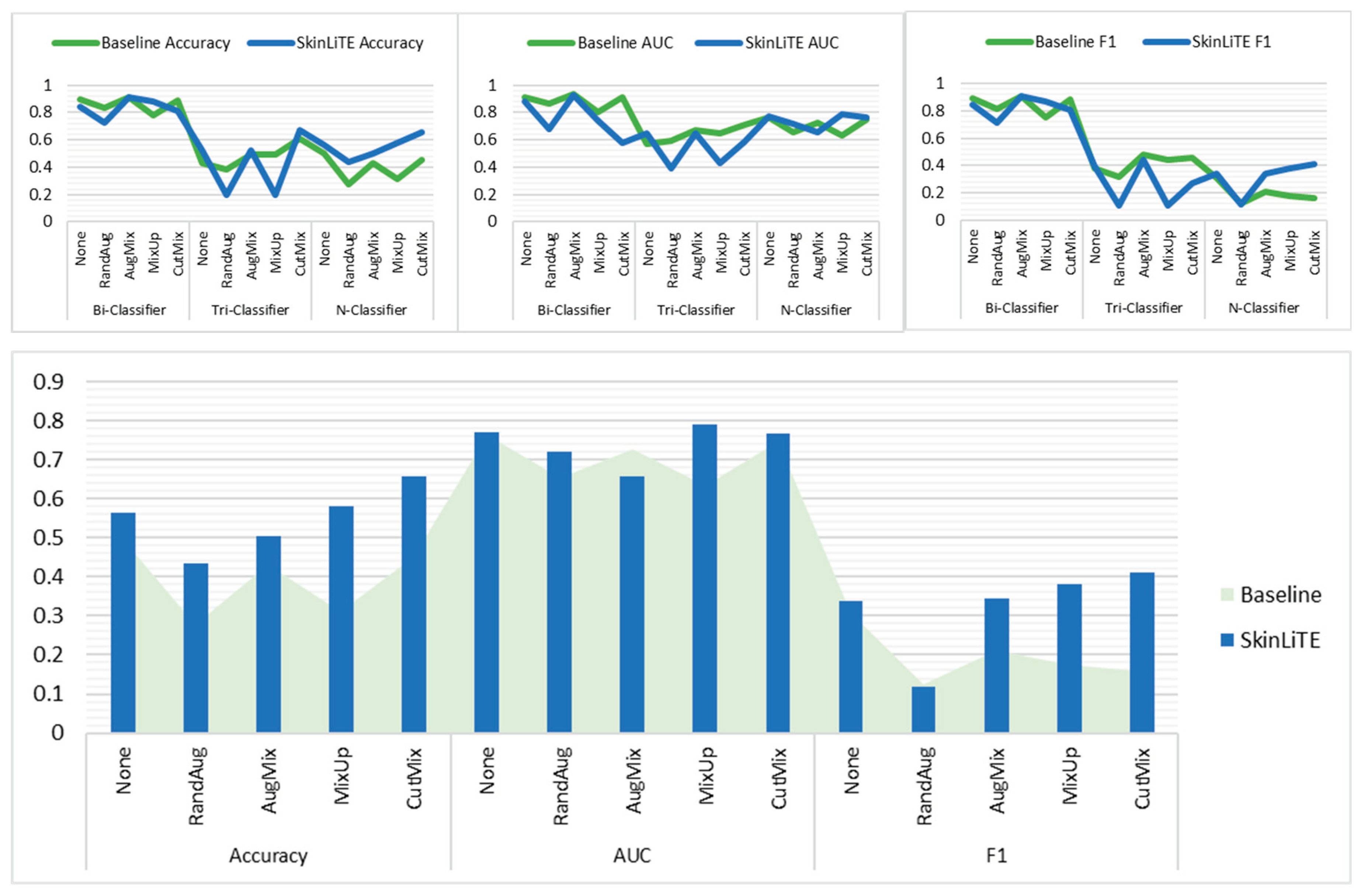 | Skin Lesions Model | Aug. Method | Traditional classifier (Supervised Learning) | SkinLiTE (Supervised Contrastive Learning) | |||||||