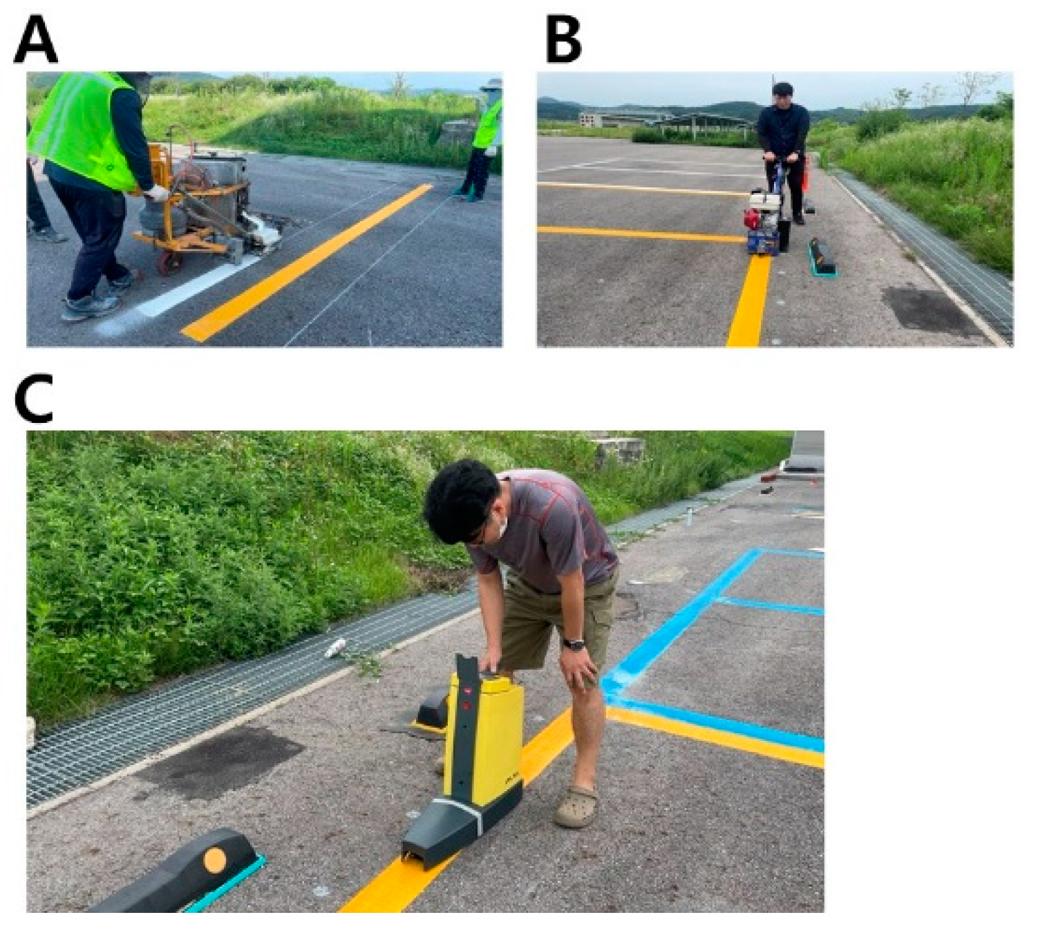 Road marking application (A), abrasion process (B), and retro-reflectivity measurement (C) for preliminary test.