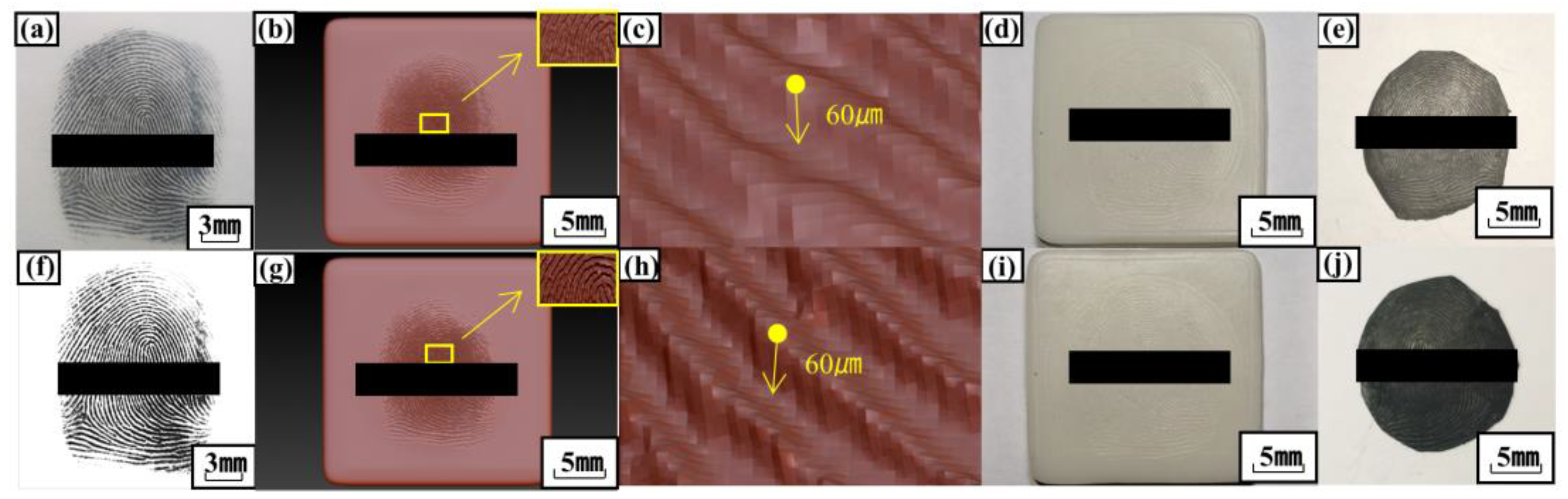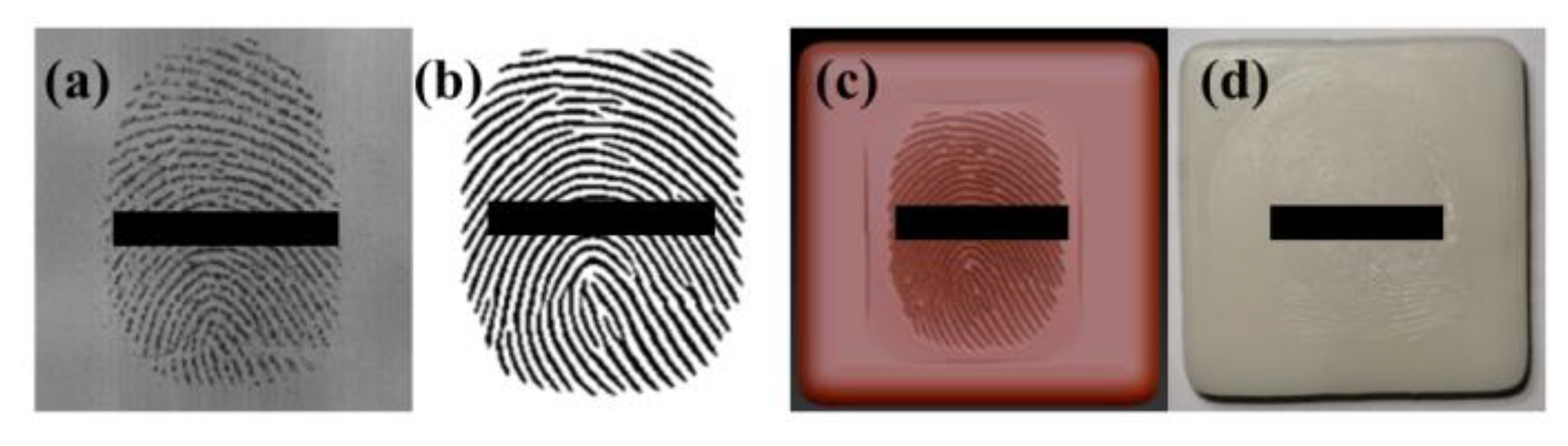 - Arora, S.S.; Cao, K.; Jain, A.K.; Paulter, N.G. Design and Fabrication of 3d Fingerprint Targets. IEEE Transactions on Information Forensics and Security. 2016, 11, 2284–2297. [Google Scholar] [CrossRef]