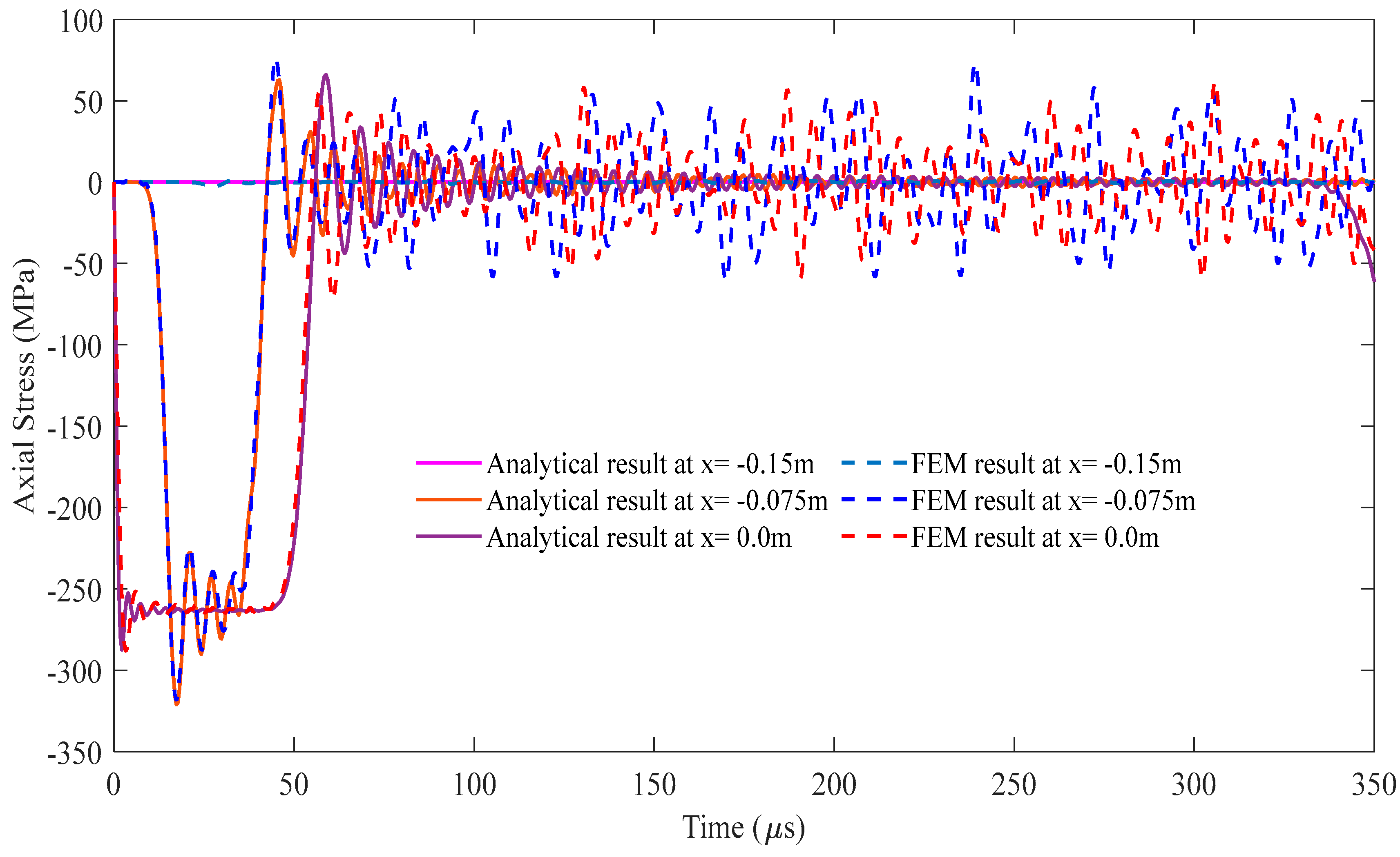 30]. When applied in wave propagation, this transform converts the original differential equation problem into an algebraic equation, making managing and solving easy. The solution is then converted back to the time domain using the inverse Laplace transform, which provides an accurate solution to the original wave propagation problem. Therefore, the Rayleigh–Love rod model, which considers the effects of lateral inertia, can be effectively solved with the Laplace transform. This analytical approach contributes to a detailed interpretation of the wave propagation dynamics and the consequential stress distribution, thereby providing substantial insights into the dynamic response of materials under stress wave propagation.
