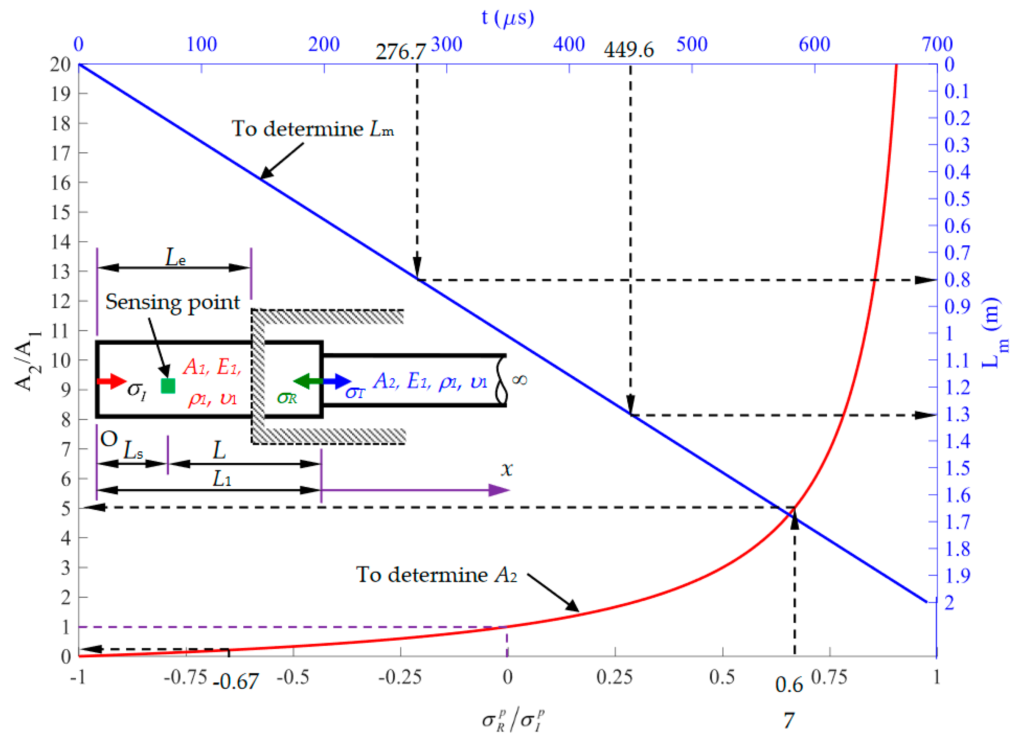 where A1 and A2 are the cross-sectional areas of segment 1 and segment 2, respectively; σI, σR, and σT are the incident, reflected, and transmitted stresses, respectively.