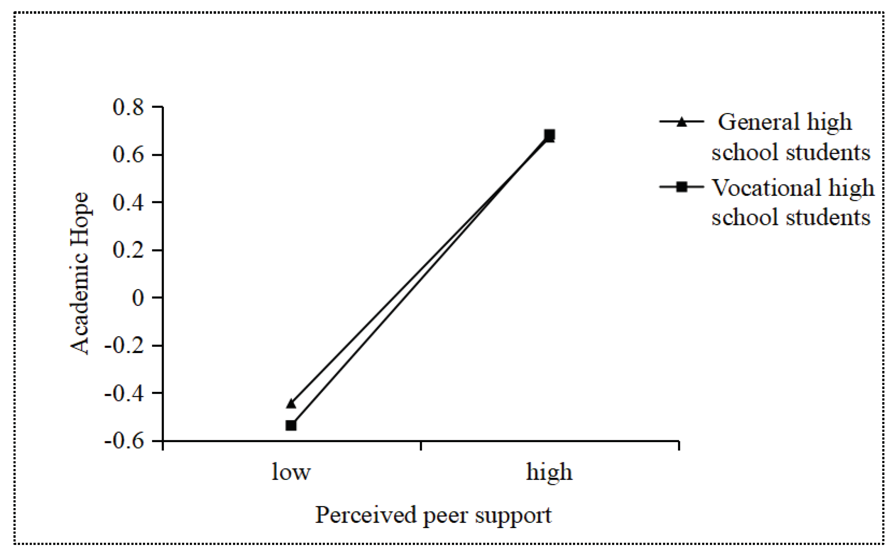 Hypothesis 5: The educational background of students moderates relationship between perceived peer support and academic hope among higher vocational college students. Specifically, students from vocational high schools are hypothesized to exhibit a more significant effect of perceived peer support on academic hope compared to their counterparts from general high schools.