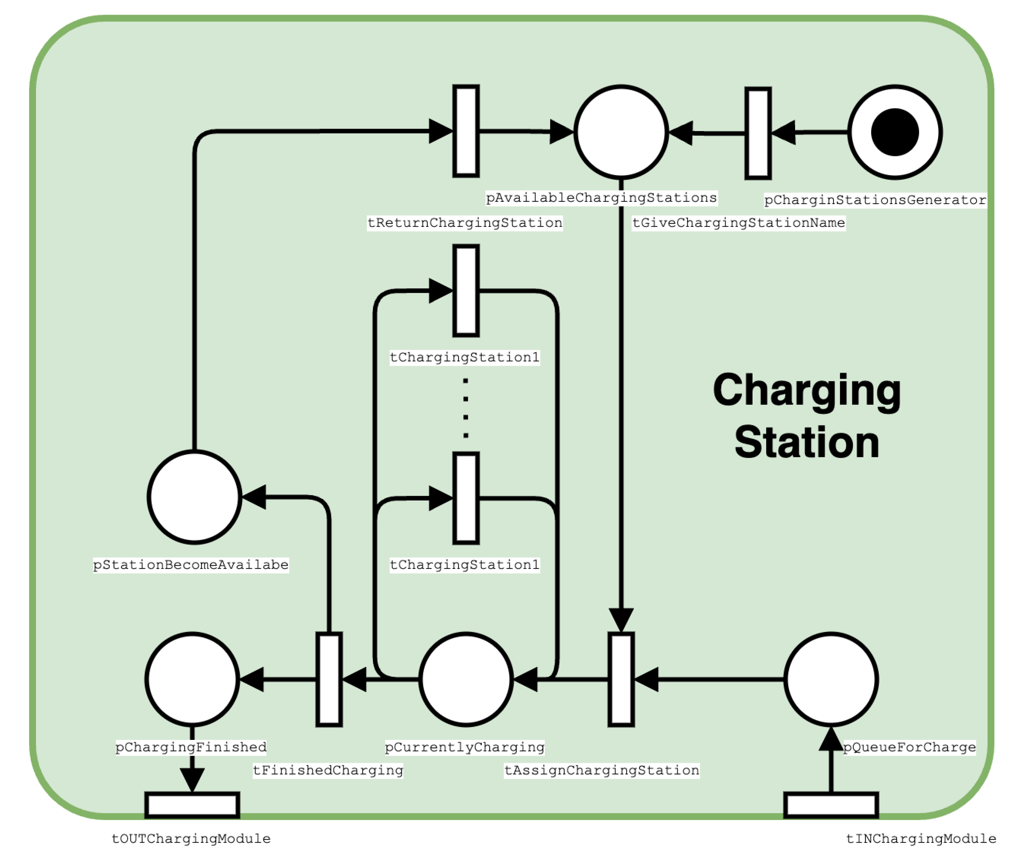 Tokens can only enter a Petri Module through its Input Ports that are transitions.