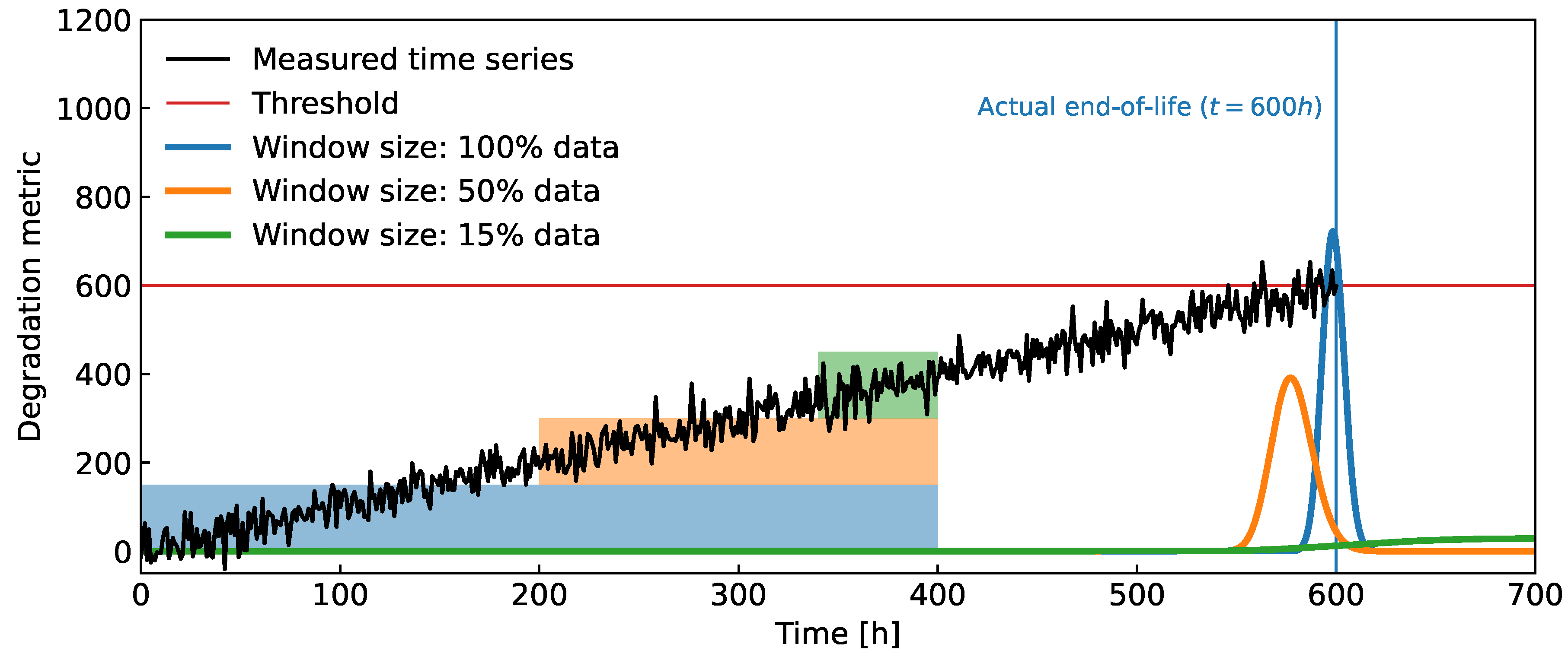 Example of the general inner workings of the proposed method. Since a change in the trend of the observed health metric is present, not all of the available data should be taken into account. A (blue rectangle) data window chooses the most recent data, from which a prediction of the FHT distribution (blue curve) is calculated.