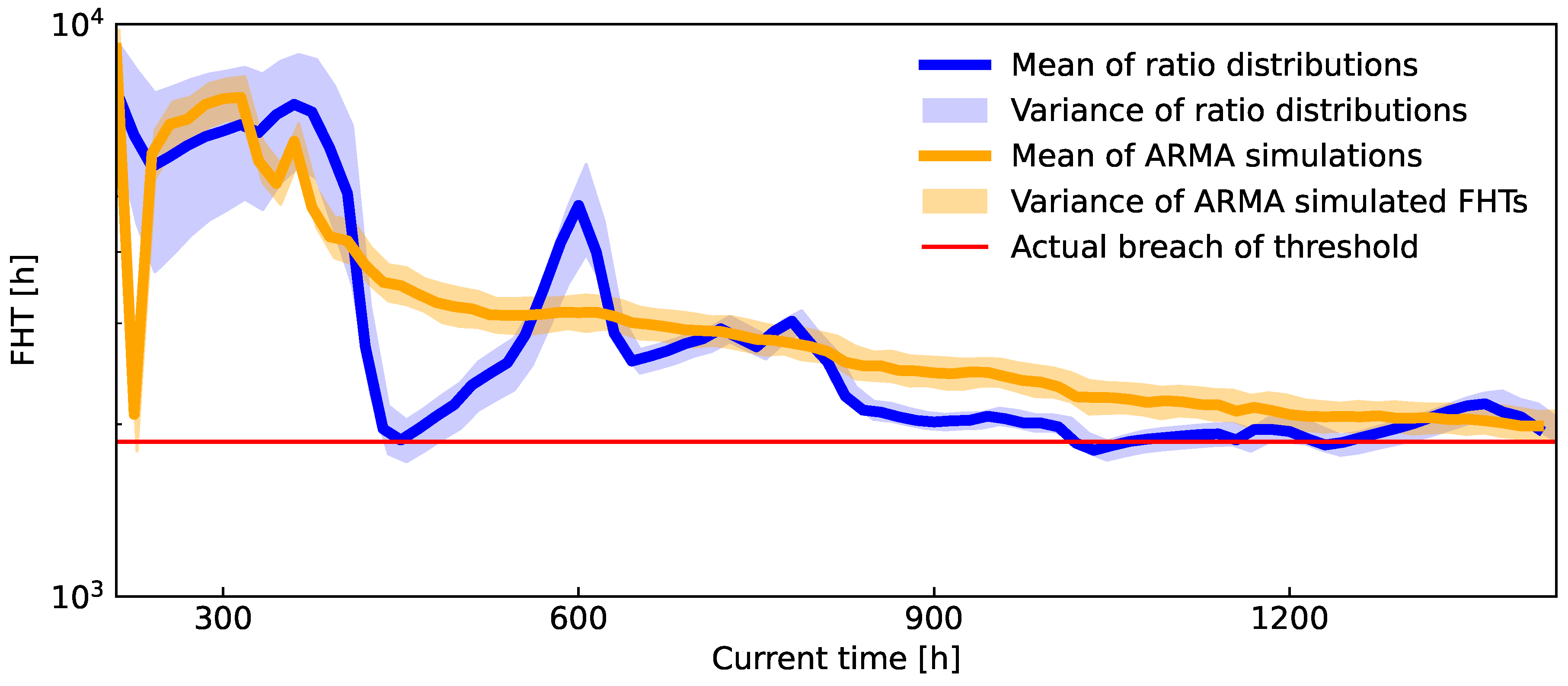 Synthetic experiment on ARMA time signal with an abrupt change in the trend (around h). Data, available for the prognosis, was limited up to h. Actual EOL is compared to results from the developed algorithm with various amounts of data taken into account.