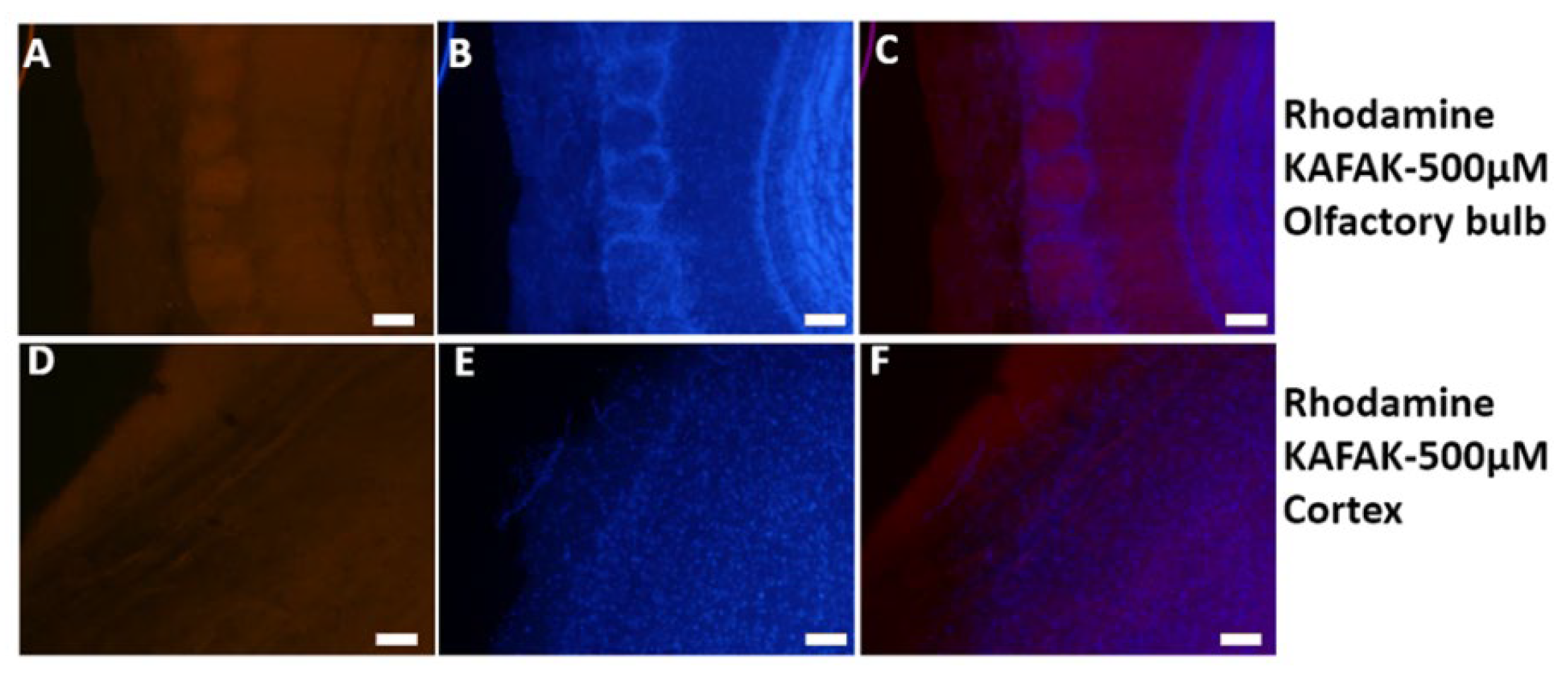 To investigate the biodistribution of KAFAK in the brain and optimize the dose and route of delivery of the peptide, we used a murine model. FITC-KAFAK was administered either intranasally or intraperitoneally. FITC-KAFAK was not observed in the brain after intraperitoneal administration. In contrast, it was observed in the olfactory bulb upon intranasal administration. However, no fluorescence was detected in more caudal regions. Furthermore, we encountered bleaching challenges with the FITC dye. After replacing the FITC label with Rhodamine (RITC), we observed a greater intensity of the labeled peptide across all regions of the brain as seen in