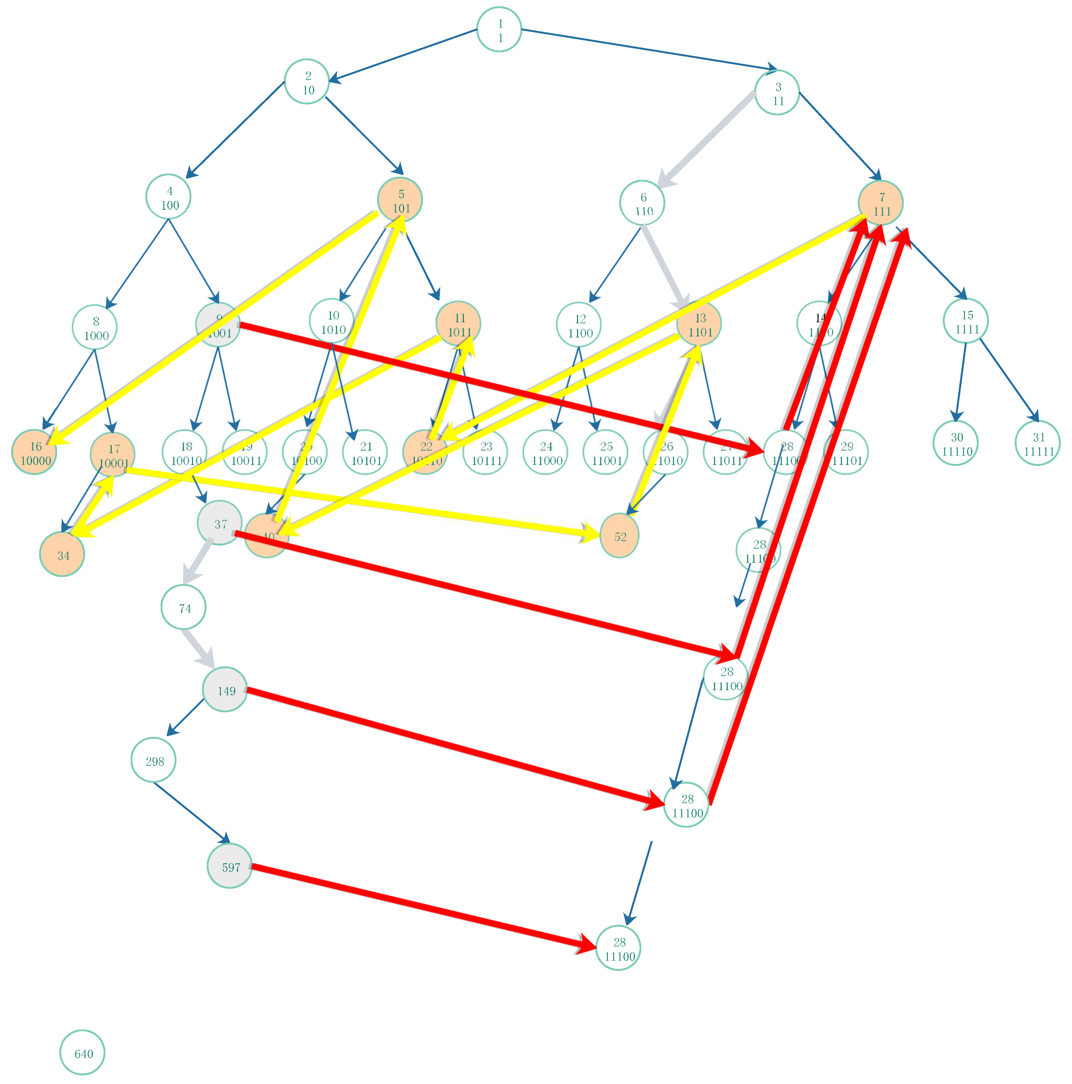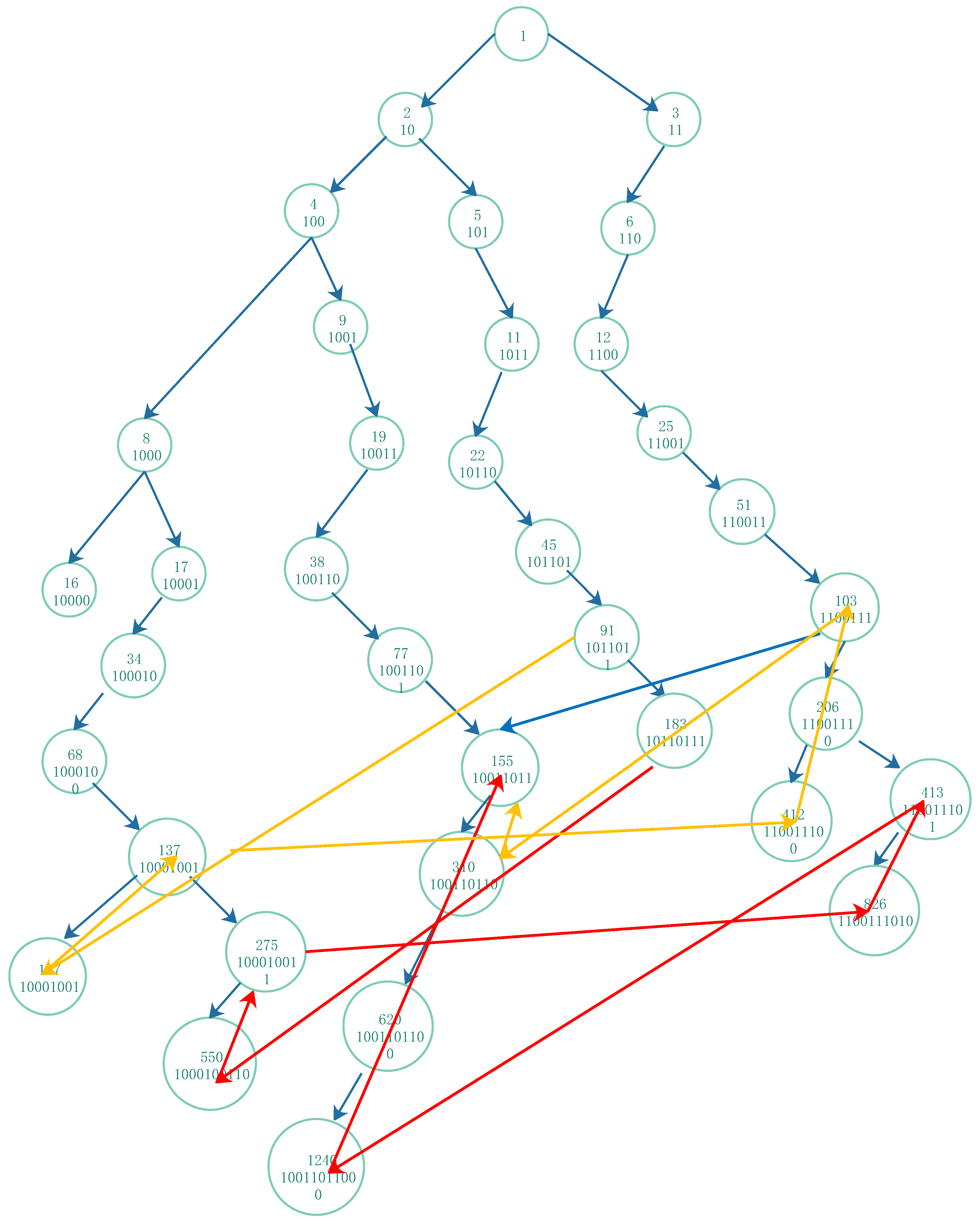 Thus for any natural number n, its binary string is the traversal path in the full binary directed tree from the root to down along the arcs. For example in Fig 3, for , it comes from the root 1 down 2,5,10, finally reach 21, it is appending 0,1,0,1 to the vertexes, . And for , it comes from the root 1 down 3,7,14, finally reach 29, it is appending 1,1,0,1 to the vertexes, .