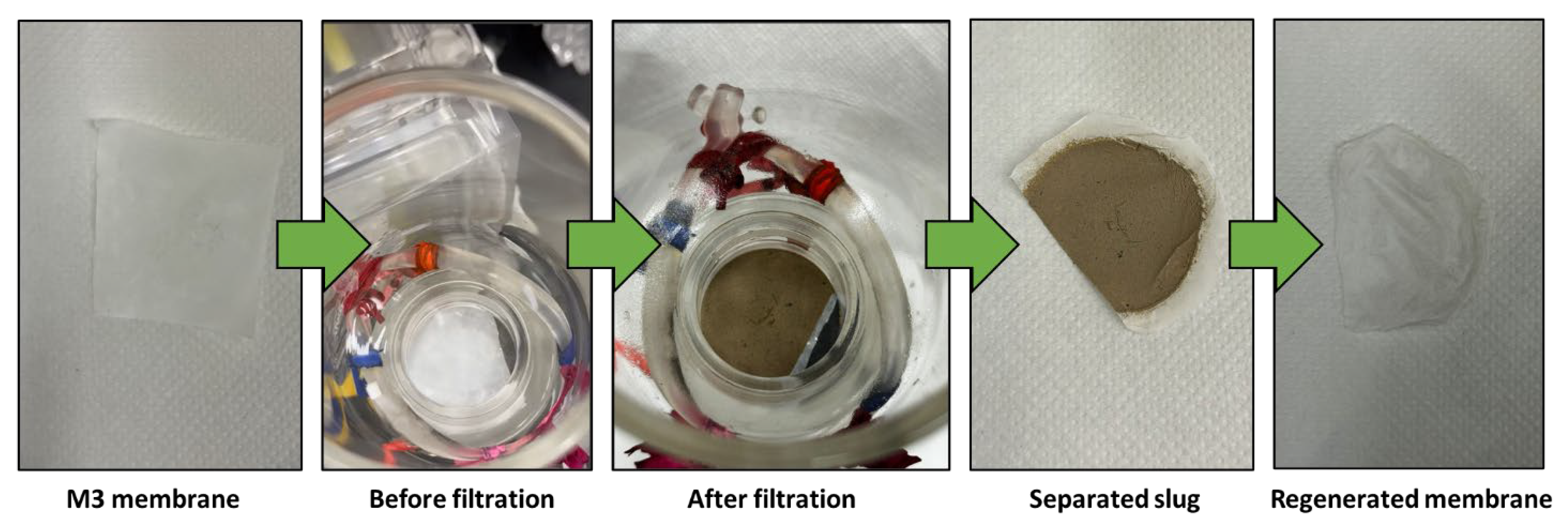 Figure 9 provides the water filtration process using mud water, presenting a comparison before and after membrane filtration. It is noteworthy that the membranes possess the ability to undergo regeneration post-filtration, enabling their reuse across multiple cycles.