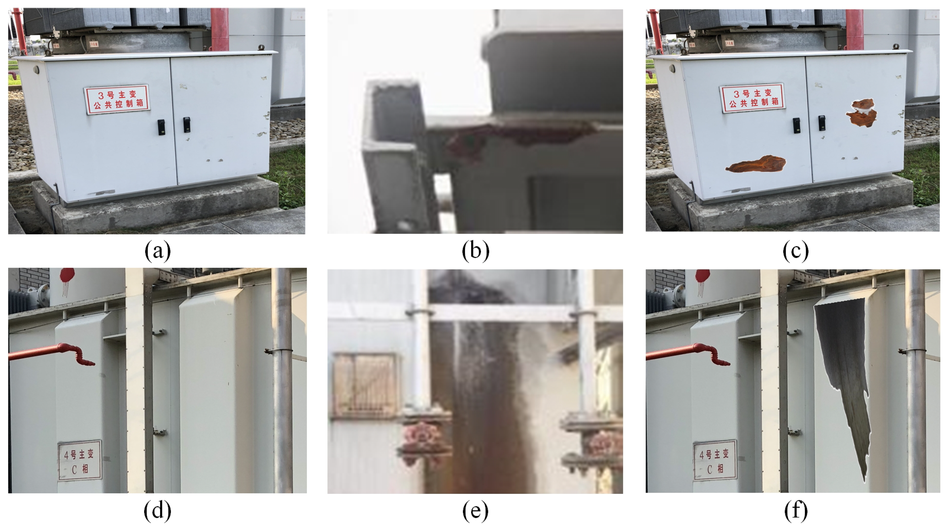 We obtained 700 images of surface defects in substation equipment through on-site scene collection, comprising 353 images of surface oil leakage and 347 images of metal rust. We also collected 1200 images of normal equipment. It is noteworthy that the collection of normal equipment images was significantly less challenging compared to the images of the other two types of defects.