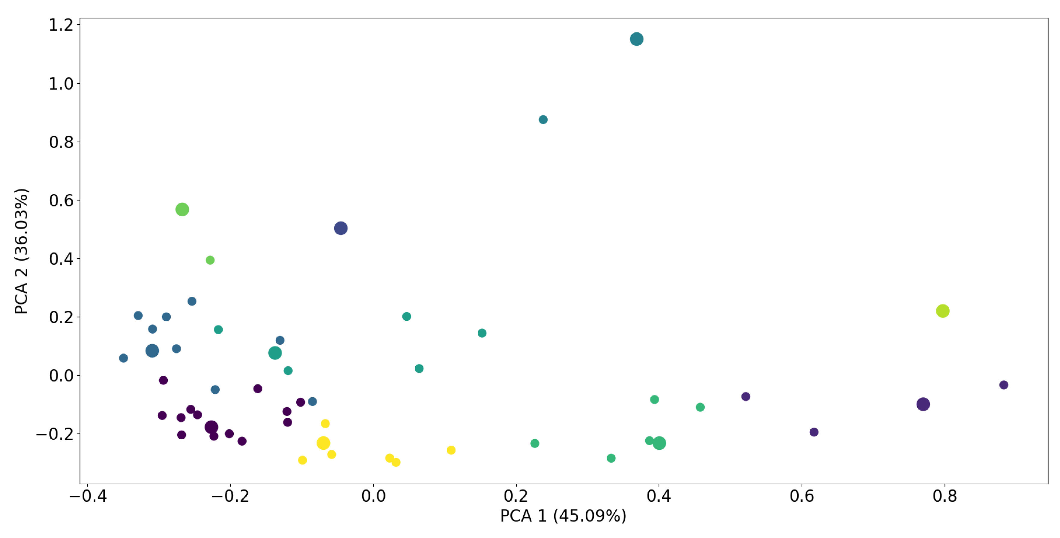 to obtain correlations between all ACORN subgroups. We then perform principal component analysis to reduce the dimensions to two and to illustrate it with a scatter plot (