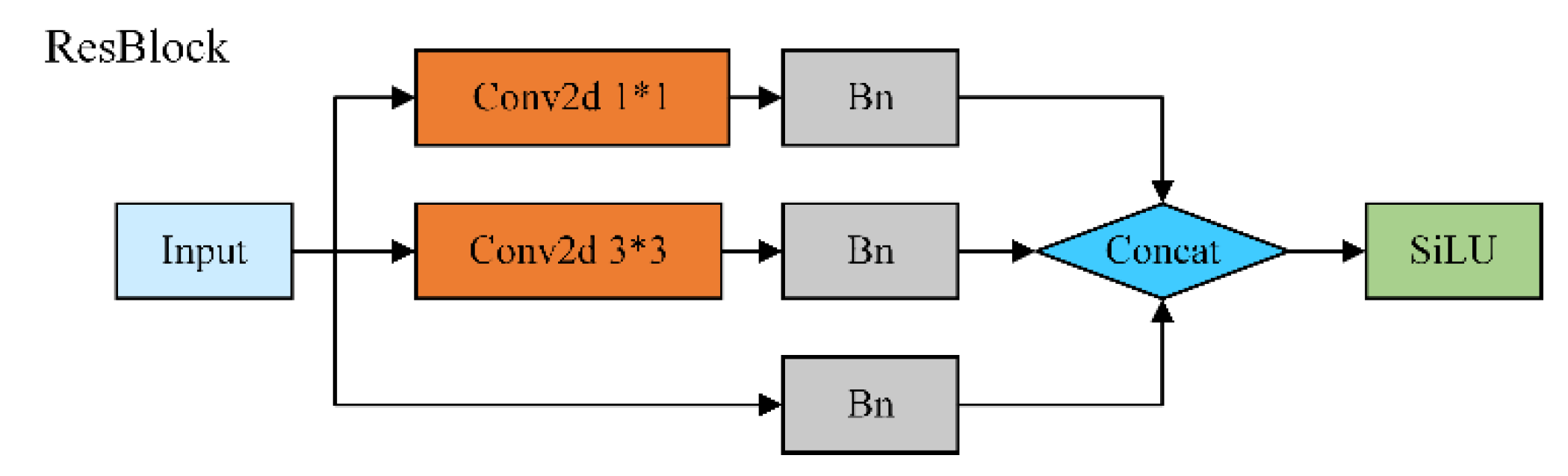 In this paper, the ResBlock module is proposed based on the idea of Inception and ResNet, with three branch designs: 1x1 convolutional kernel, 3x3 convolutional kernel, and jump connection, and each branch contains a BN [