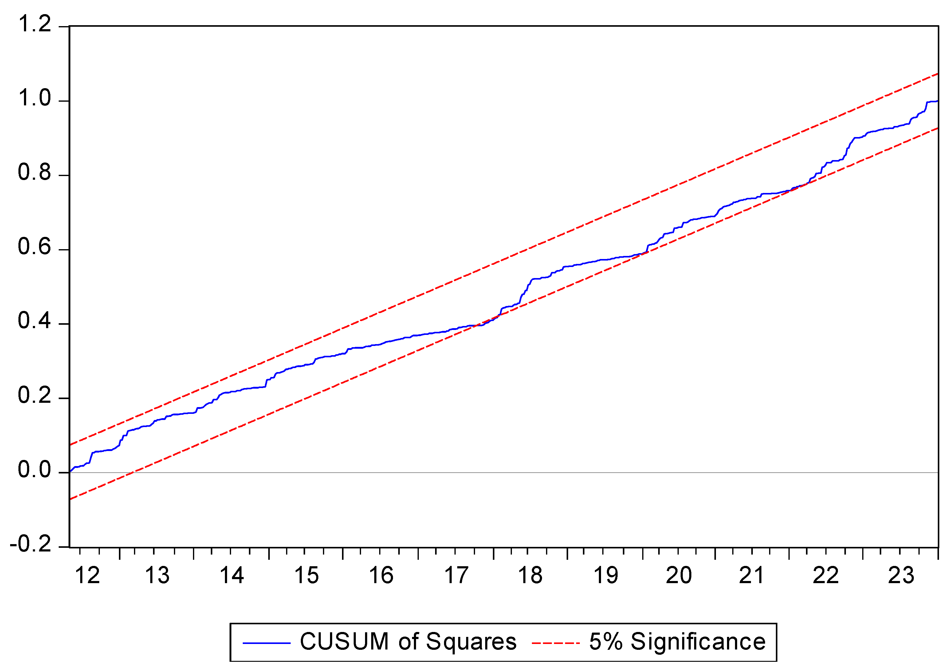We need to check the stability of the estimated coefficients because the NARDL approach is sensitive to structural breaks while the studied variables are sensitive to global events. In this study we used the cumulative sum of the recursive residuals (CUSUM) and the cumulative sum of squared recursive residuals (CUSUMSQ) tests proposed by Brown et al. (1975) to investigate the long-term stability of the coefficients in the model.