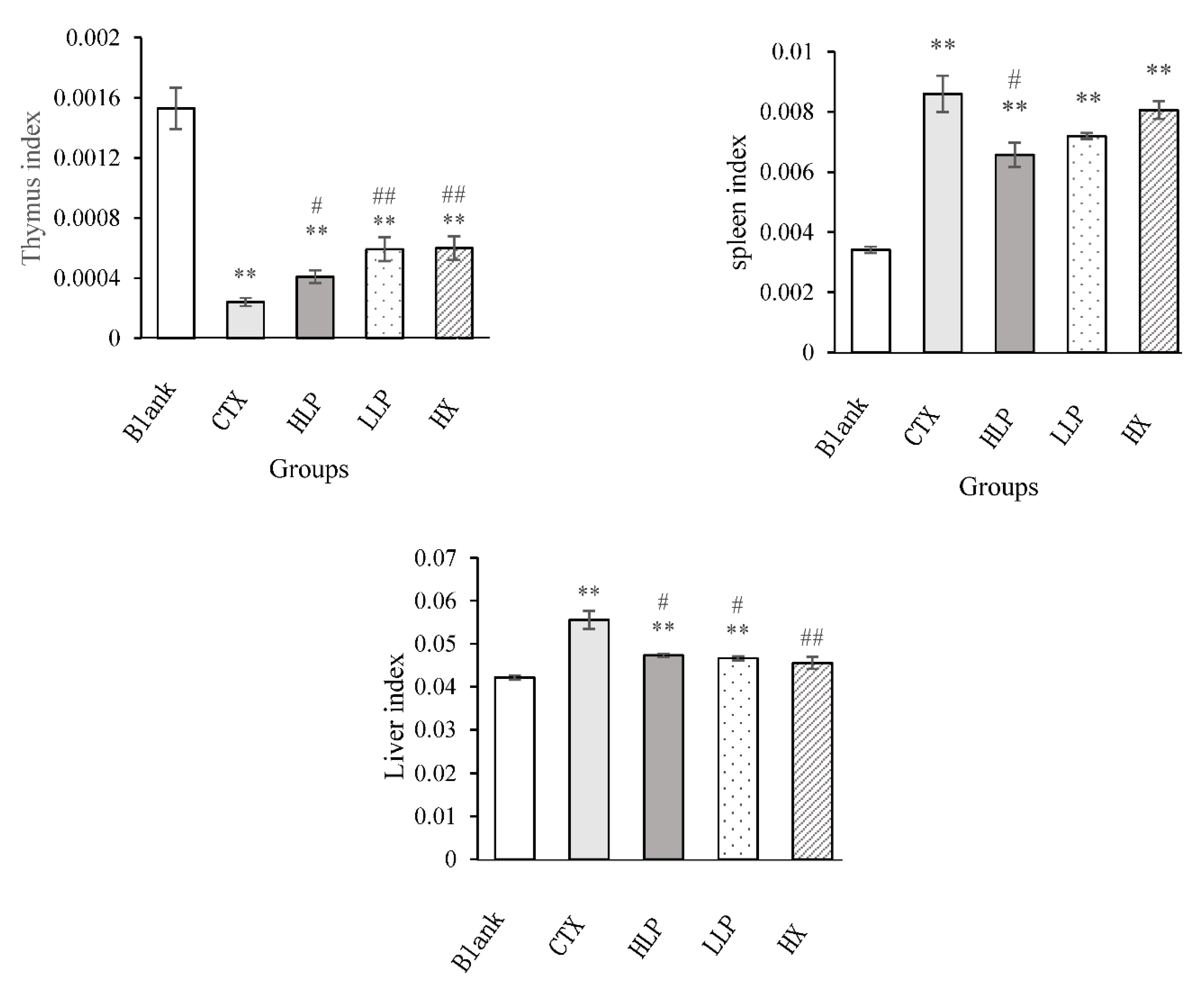 Figure 1. The thymus index of the model group was significantly lower than that of the blank group (P < 0.01). Compared with the model group, the thymus index of mice in high and low concentration LP group and positive control group increased significantly (P < 0.05 or P < 0.01), which showed that lily polysaccharide LP could increase the thymus index of immunosuppressive mice, and the effect of low concentration LP was stronger than that of high concentration LP. The spleen index of mice in each group was significantly higher than that in the blank group (P < 0.01), which may be due to the proliferation of spleen fibrous tissue caused by intraperitoneal injection of CTX, resulting in splenomegaly [