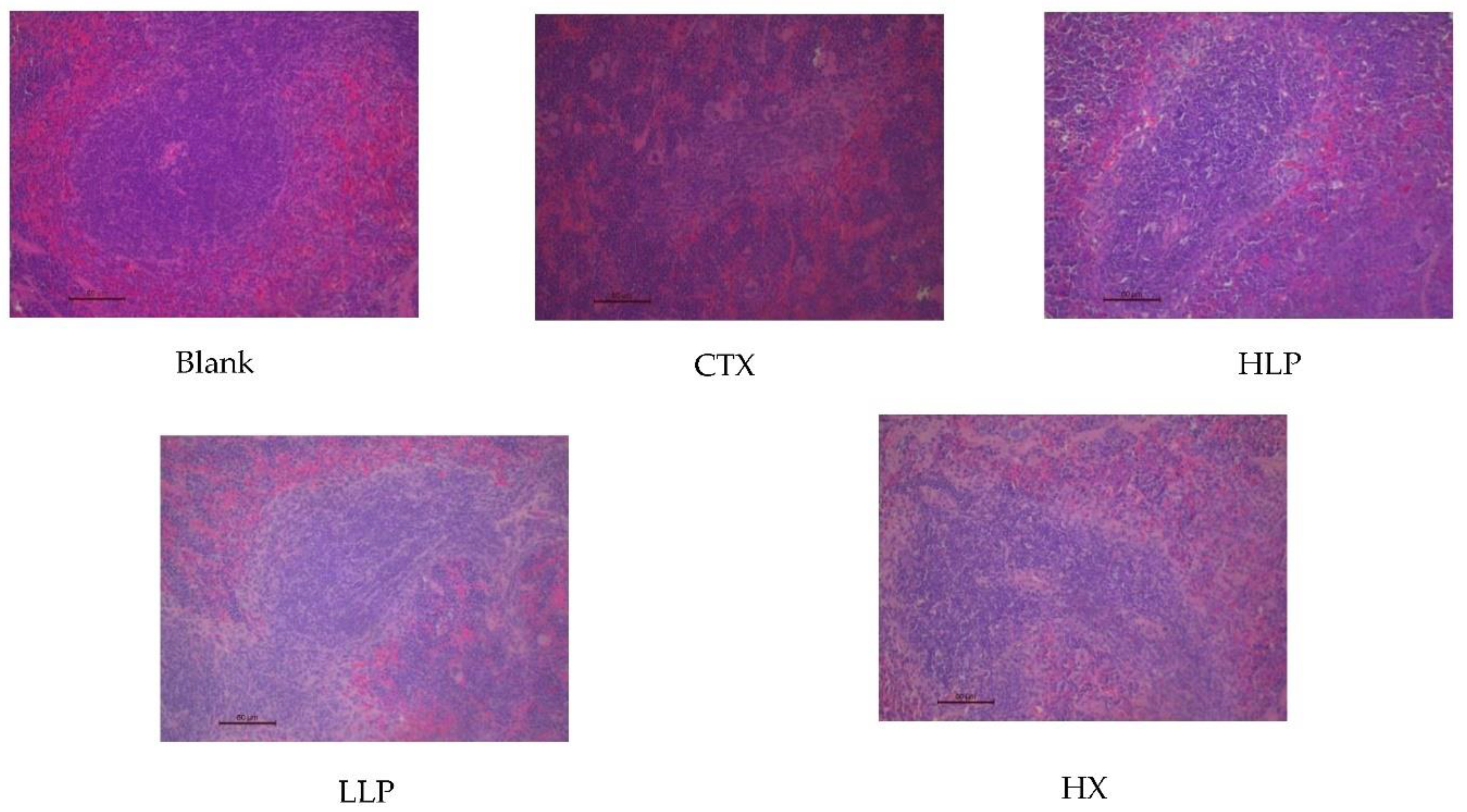 Figure 2, the liver of mice in the blank group was intact, with large and round nuclei, and liver plates and hepatic sinuses were neatly arranged. In the model group, liver lesions were observed, including morphological changes of liver cells, destruction of nucleus, disordered arrangement of liver plate and hepatic sinuses, indicating that the immunosuppression model was established successfully and the liver was damaged. After lily polysaccharide and leomisole hydrochloride treatment, the hepatic cell morphology, hepatic plate and hepatic sinus arrangement of mice were alleviated to varying degrees compared with the model group, effectively alleviating the liver injury caused by CTX. As shown in
