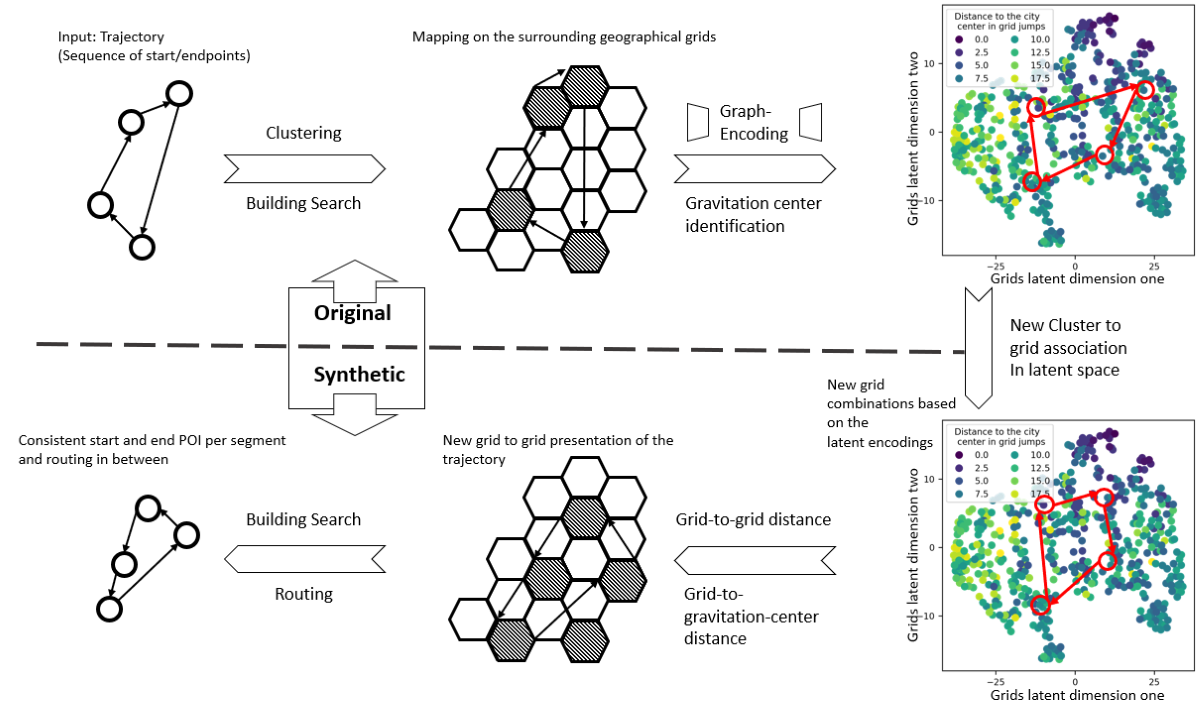 Figure 1. The more detailled component view is in Figure 3. The paper is structured as follows: Chapter 2 discusses the state-of-the-art geospatial embedding and synthetic trajectory generation methods. Afterwards, chapter 3 introduces the proposed method of autoencoder-based neighborhood respective trajectory generation. Finally, Chapter 4 shows the result of the proposed method when applied to a dataset from the Mobilitaet.Leben study from Munich.