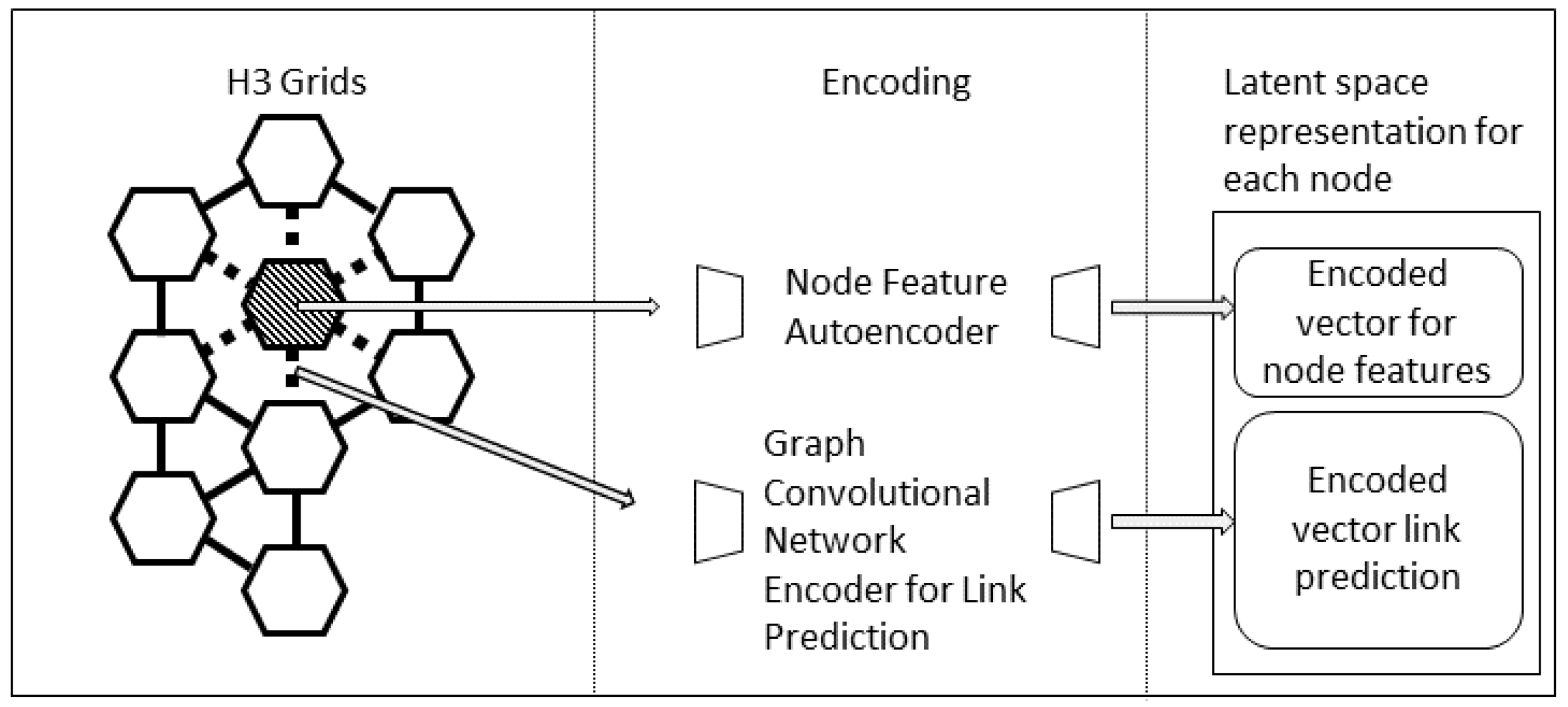 Figure 5. This graph consists of the nodes as the H3 grids within the area and the edges connecting each grid to its neighbors. The edge weight is given as 1, and the attributes of each node are the counted OSM features. The encoder consists of two Convolutional Layers from [