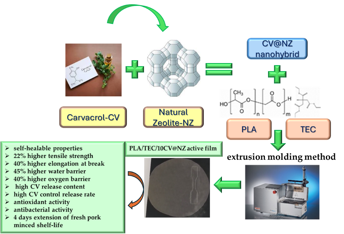 A novel green vacuum-adsorption method for loading high CV contents into edible NZ is presented here. To characterize the obtained CV@NZ nanohybrids desorption studies are performed for the first time. Then the CV@NZ nanohybrid was loaded in a PLA/TEC matrix at 5, 10, and 15 %wt. contents to obtain novel PLA/TEC/xCV@NZ (x=5, 10 and 15) active packaging films via a melt extrusion method. For comparison PLA/TEC based films were prepared via melt extrusion process by adding 5, 10 and 15 %wt. pure NZ. All as-prepared PLA/TEC/xNZ and PLA/TEC/xCV@NZ films were characterized by X-Ray Diffraction (XRD) analysis, Fourier Transform Infrared (FTIR) spectroscopy and Scanning Electron Microscopy (SEM). Their tensile and thermomechanical properties and water/oxygen barrier properties were also studied. Additionally, CV release experiment, antioxidant activity test via 2,2-Diphenyl-1-picrylhydrazyl (DPPH) assay method and antibacterial activity test against food pathogens were performed. The most promising active packaging film was used to wrap fresh minced pork and a shelf-life experiment was performed by monitoring lipid oxidation, heme iron content, total viable count (TVC) and sensory analysis scores. Overall, the innovative points of the current study are: (i) the novel vacuum adsorption method employed to obtain CV@NZ nanohybrid, (ii) the innovative low-cost method based on desorption kinetic experiments to determine the %wt. loading content as well as the desorption energy of CV on such CV@NZ nanohybrid (iii) the preparation and characterization of such PLA/TEC/xCV@NZ active films, and (iv) a shelf-life study of the optimum PLA/TEC/xCV@NZ film for the preservation of fresh minced pork.