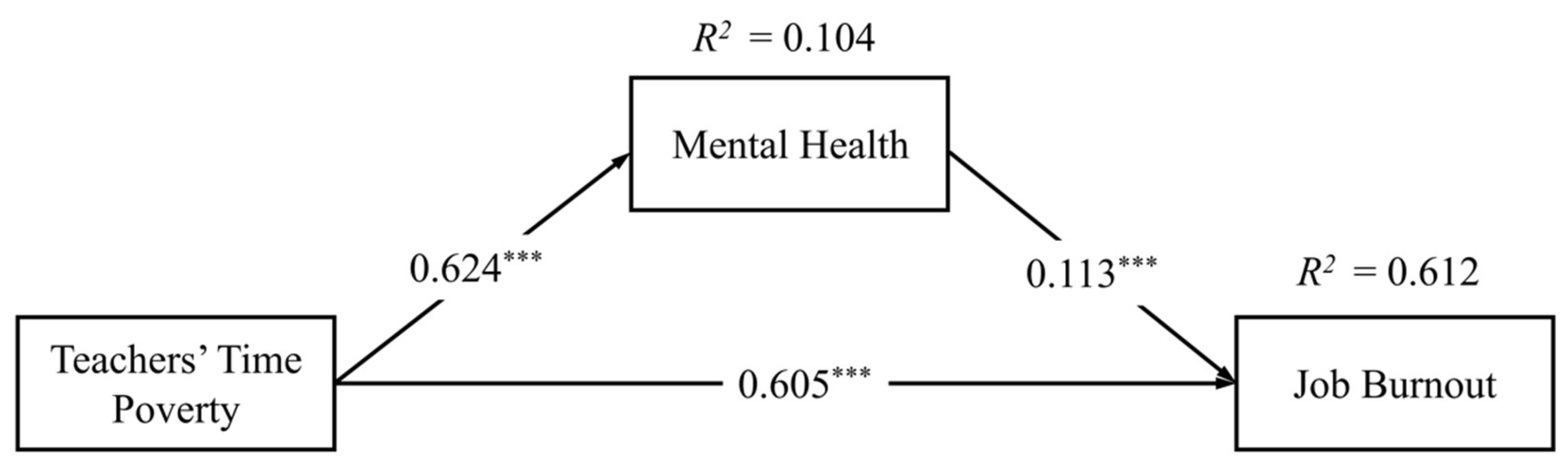 Hypothesis 6 (H6). Teachers’ negative mental health could play the mediating role in the relationship between teachers’ time poverty and job burnout.