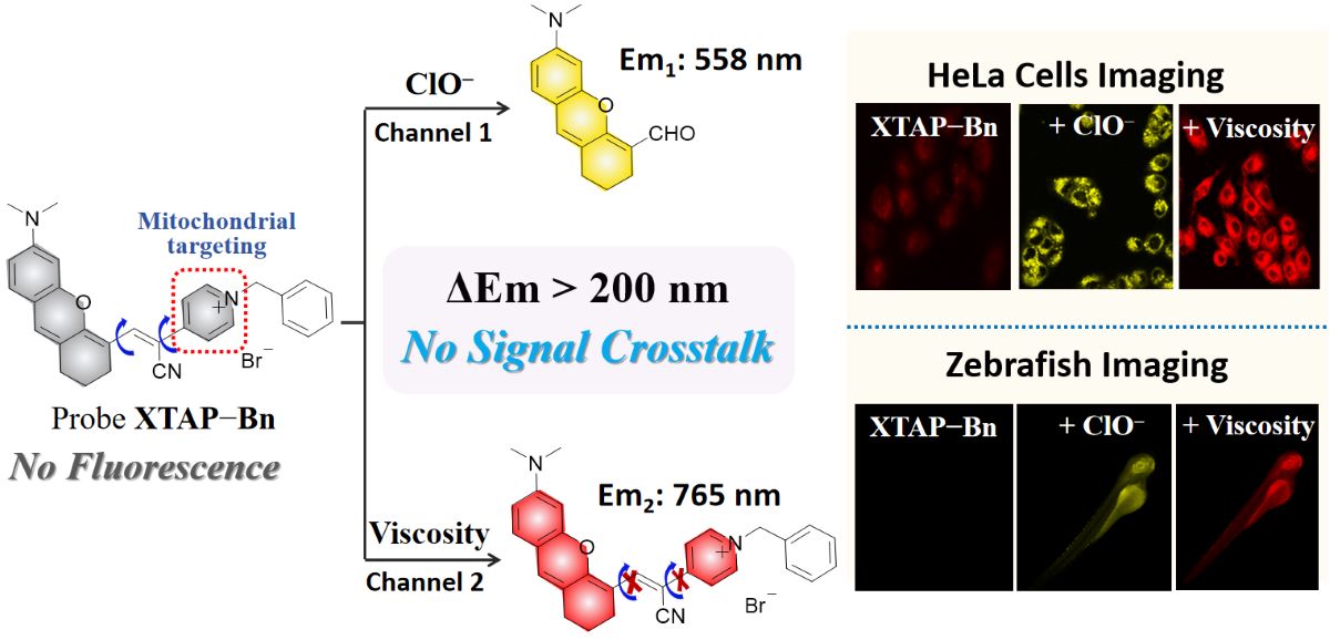 (a) The illustration of dual-response fluorescent probe with signal crosstalk and without signal crosstalk. (b) The proposed mechanism of probe XTAP−Bn toward ClO− and viscosity.