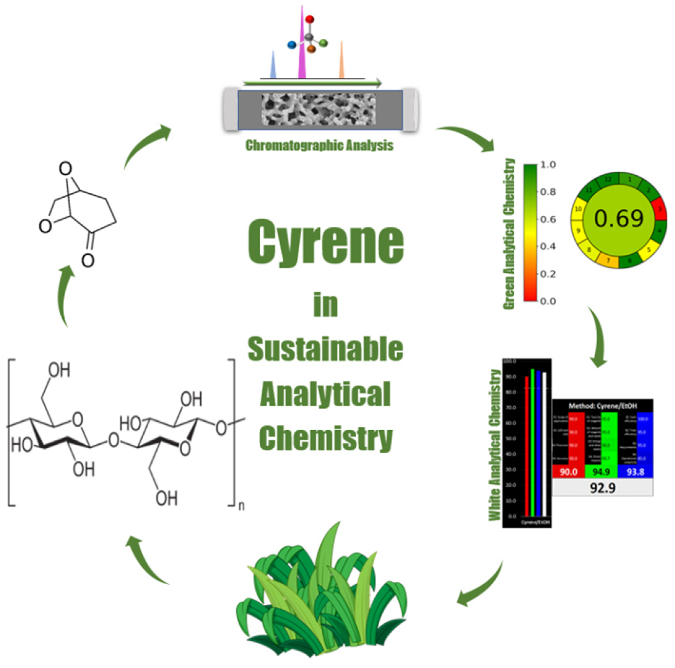 29]. All probably lack the emphasis on sustainable solvents for liquid chromatographic analysis. In fact, solvent selection guidelines to rank solvents based on their greenness are mainly established with orientation to the use of the solvent in synthesis and might be biased when considering their use for chromatographic analysis. For instance, according to CHEM21 solvent selection guideline, the environmental (E) profile for dihydrolevoglucosenone (Cyrene) is scored 7 and assigned as a problematic solvent because of the high boiling point and thus the difficulty of evaporating when used in synthesis. However, this high boiling point is considered advantages when thinking about its suitability for chromatographic analysis because it makes it easy and inexpensive to recycle and allows the possibility to run heated and superheated liquid chromatography. Therefore, the ranking for chromatography can be reversed depending on liquid chromatographic suitability. An ideal disadvantage-free completely sustainable organic solvent for LC analysis is still unavailable. Based on the EHS environmental, health, and safety index a favourable green solvent for chromatographic analysis is the one that can be produced from biomass routes with low energy and low cost compared to petrochemical routes and the one that is also biodegradable. Biobased solvents should whenever possible be integrated in liquid chromatographic analysis to enhance sustainability. For instant Cyrene is an organic solvent that is available as bio-based chemical from renewable feedstock and has shown promising potential for use as organic solvent in chromatography [