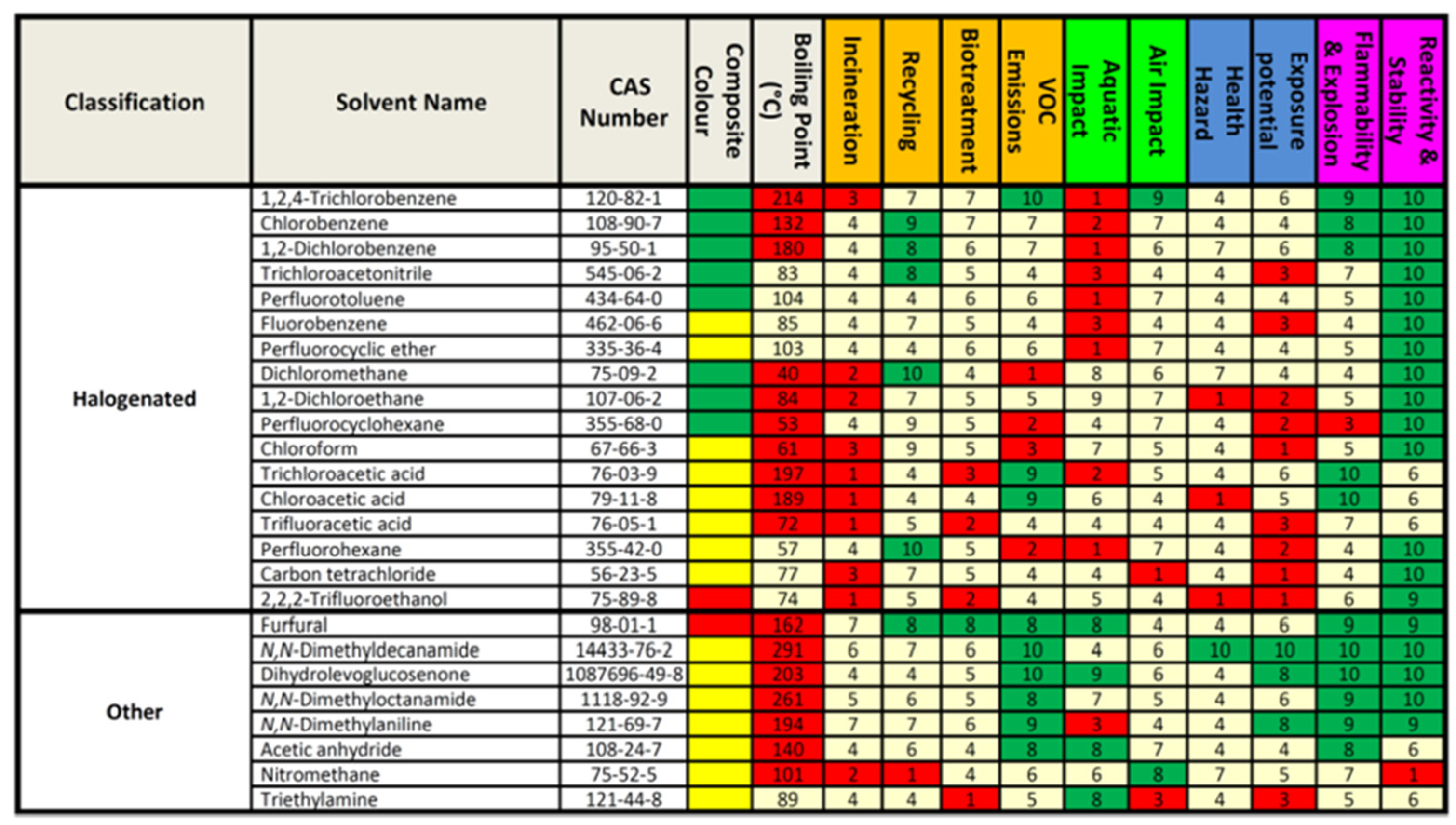 Table 2 the author of this manuscript listed properties and parameters of 17 solvents for normal, HILIC and reversed phase liquid chromatography taking in account suitability parameters for liquid chromatographic analysis in addition to greenness. The suitability requirements should be balanced against greening requirements to choose the best solvent for the intended application. The values for each solvent are based on the solvent data sheet SDS, G- Score, and relative hazards resources. Subjected to a future update with more solvents,