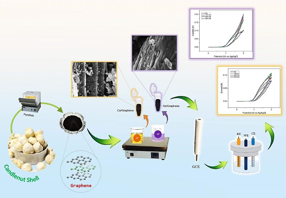Subsequently, doped carbon samples were employed to modify the surface of glassy carbon electrodes (GCE). Cyclic voltammetry (CV) and linear sweep voltammetry (LSV) were utilized to investigate the electrochemical properties, shedding light on the performance enhancement achieved through rare earth metal doping. This research explores the potential of utilizing agricultural waste-derived graphene doped with rare earth metals as a promising avenue for advanced electrode materials, contributing to the development of sustainable and high-performance energy storage systems.