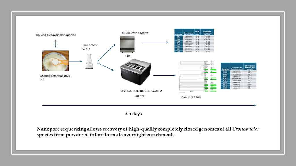 Precision metagenomic approaches using Oxford Nanopore Technology (ONT) sequencing has been shown to allow recovery of complete genomes of foodborne bacteria from overnight enrichments of agricultural waters. This study tests the applicability of a similar approach for Cronobacter genome recovery from powdered infant formula (PIF) overnight enrichments, where Cronobacter typically dominates the overall microbiome (>90%). This study aimed to test whether using ONT sequencing of overnight PIF enrichments could recover a completely closed Cronobacter genome for further genomic characterization. Ten PIF samples, each inoculated with different Cronobacter strains, covering Cronobacter sakazakii, C. muytjensii, C. dublinensis, C. turicensis, and C. universalis, were processed according to the Bacteriological Analytical Manual (BAM) protocol. Real-time quantitative PCR (qPCR) was used for initial screening (detection and quantification) of the overnight enrichments and confirmed that the inoculated PIF samples after the overnight enrichment have high levels of Cronobacter (107 to 109 CFU/mL). DNA from overnight PIF enrichments was extracted from the enrichment broth and sequenced using ONT. Results showed that ONT sequencing could accurately identify, characterize, and close the genomes of Cronobacter strains from overnight PIF enrichments in 3 days, much faster than the nearly two weeks required by the current BAM method. Complete genome recovery and species differentiation were achieved. This suggests that combining qPCR with ONT sequencing provides a rapid, cost-effective alternative for detecting and characterizing Cronobacter in PIF, enabling timely corrective actions during outbreaks.