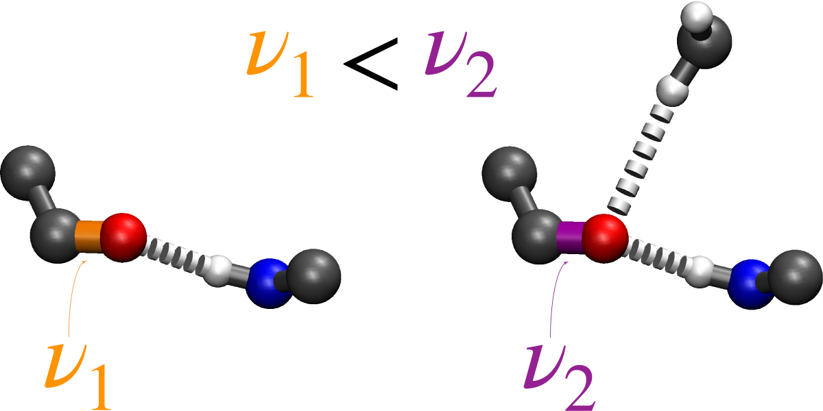 - The inter-helical H-bonding system contained the canonical H-bond described above, with an additional non-canonical inter-helical hydrogen bond. The C−H of glycine 83 from the opposing helix is bonded to the same carbonyl of valine 80 that is also involved in the canonical hydrogen bond. This system was mimicked by two N-methylacetamides forming the canonical H-bond to which an acetylglycinemethylamide is hydrogen bonded.