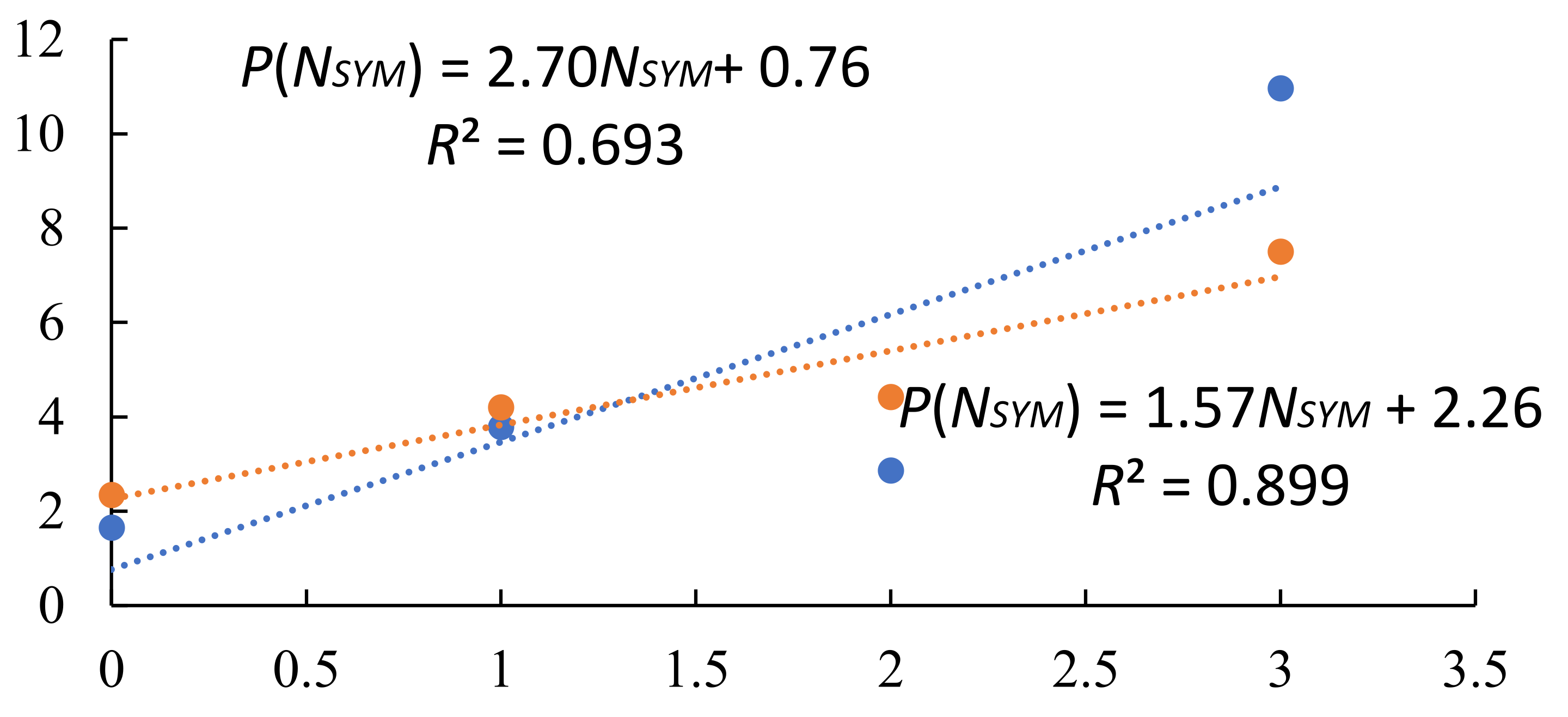 For comparison, we studied "symbol-like" 2D colloidal clusters. In such clusters, negative correlations between frequency and symmetry were observed, i.e., more symmetric letters are less frequent with the coefficients of determination of and . This is explained by the fact that in natural systems more symmetric forms have lower mobility and there are fewer ways of building symmetric clusters than asymmetric ones.