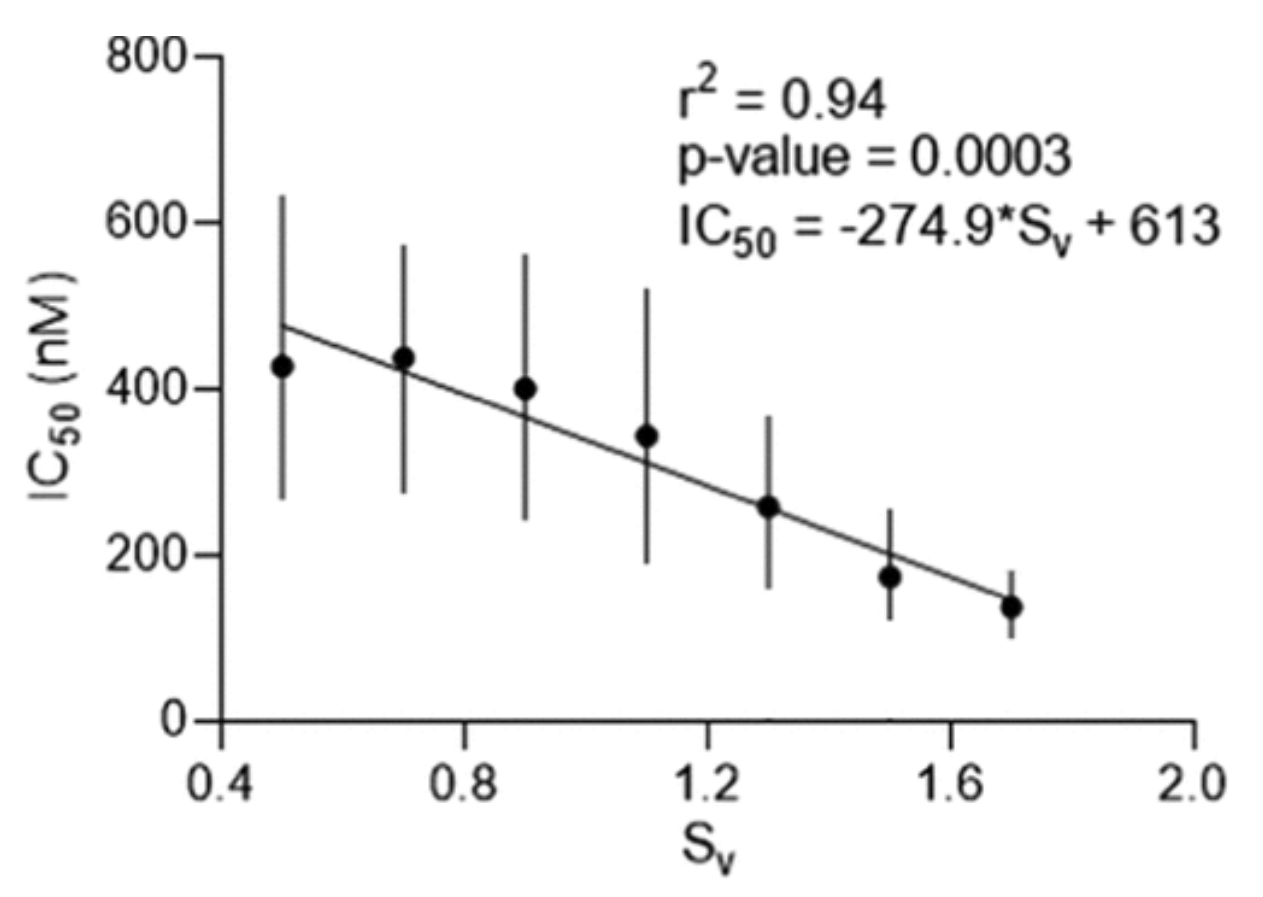 Correlation between the VE and affinity to the SARS-CoV-2 main protease (Mpro) represented by half-maximal inhibitory concentration (IC50), from [