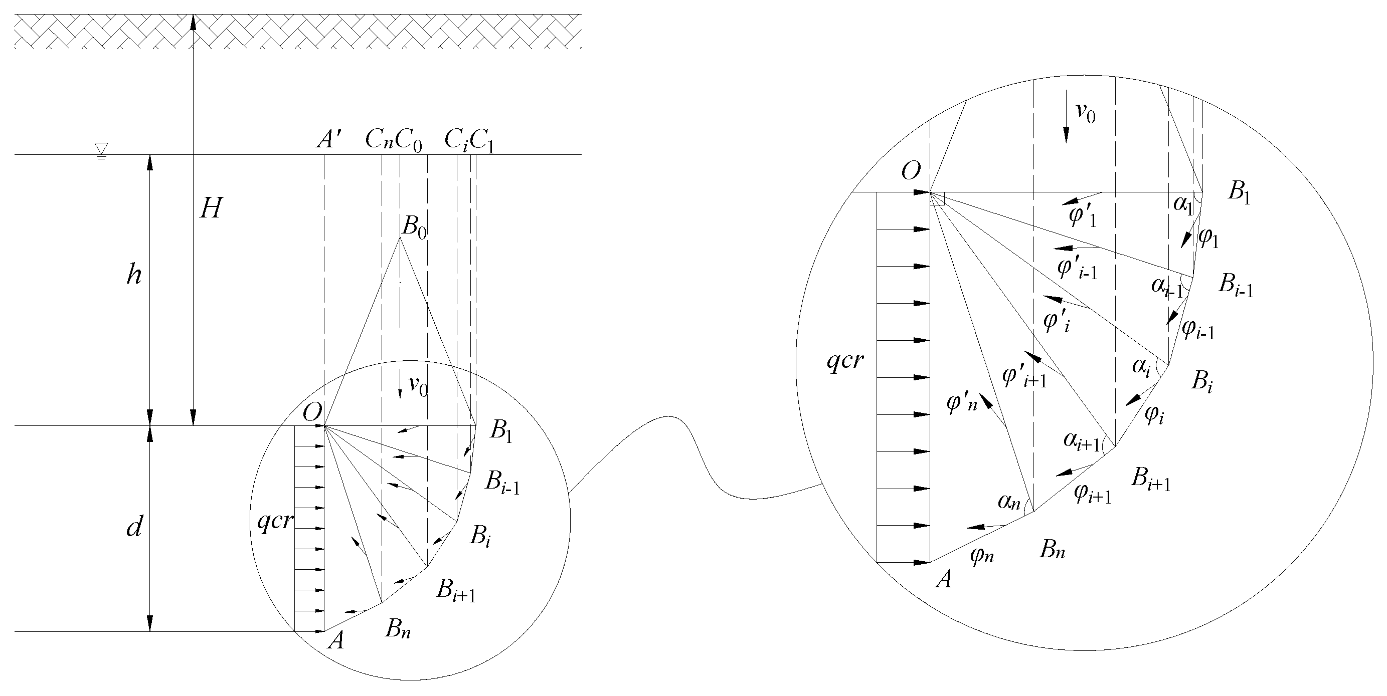 The upper part of this mechanism is an isosceles triangle with a 2φ0 vertex angle, and it has the vertical down direction v0. Parameter φ0 is an unknown variable that needs to be optimized and it represents the internal frictional angle under its current stress state conditions. The lower part is consisted of rigid triangle blocks with the vertex angle of same size . The parameters φi and represent internal frictional angles in each rigid triangle block and are determined by its own stress states. They need to be optimized. h represents the vertical distance from the tunnel vault to the water table, and d means the tunnel span.