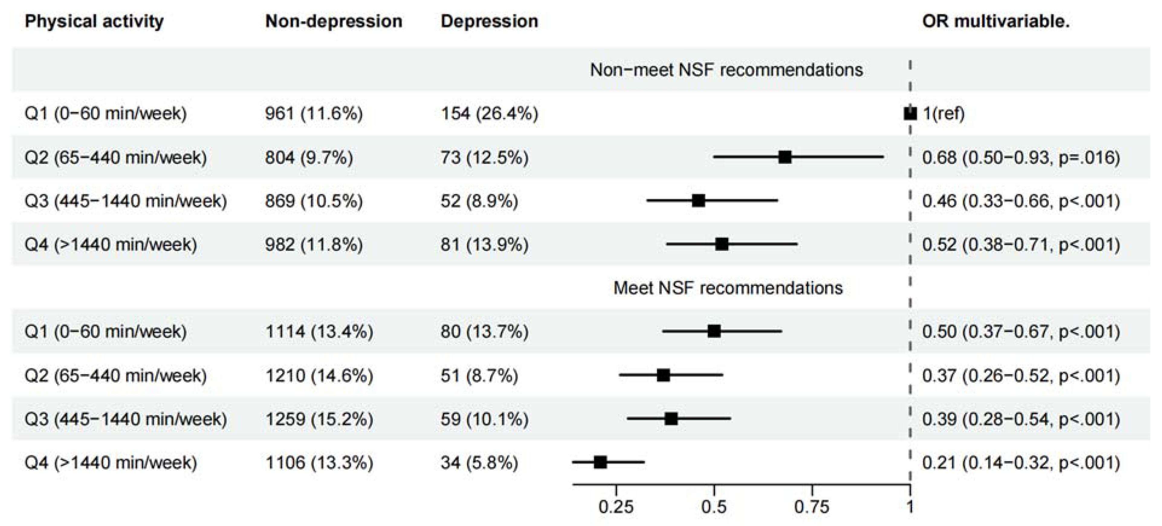 3.2. Joint Associations of PA and Sleep Duration with Symptoms of Depression
