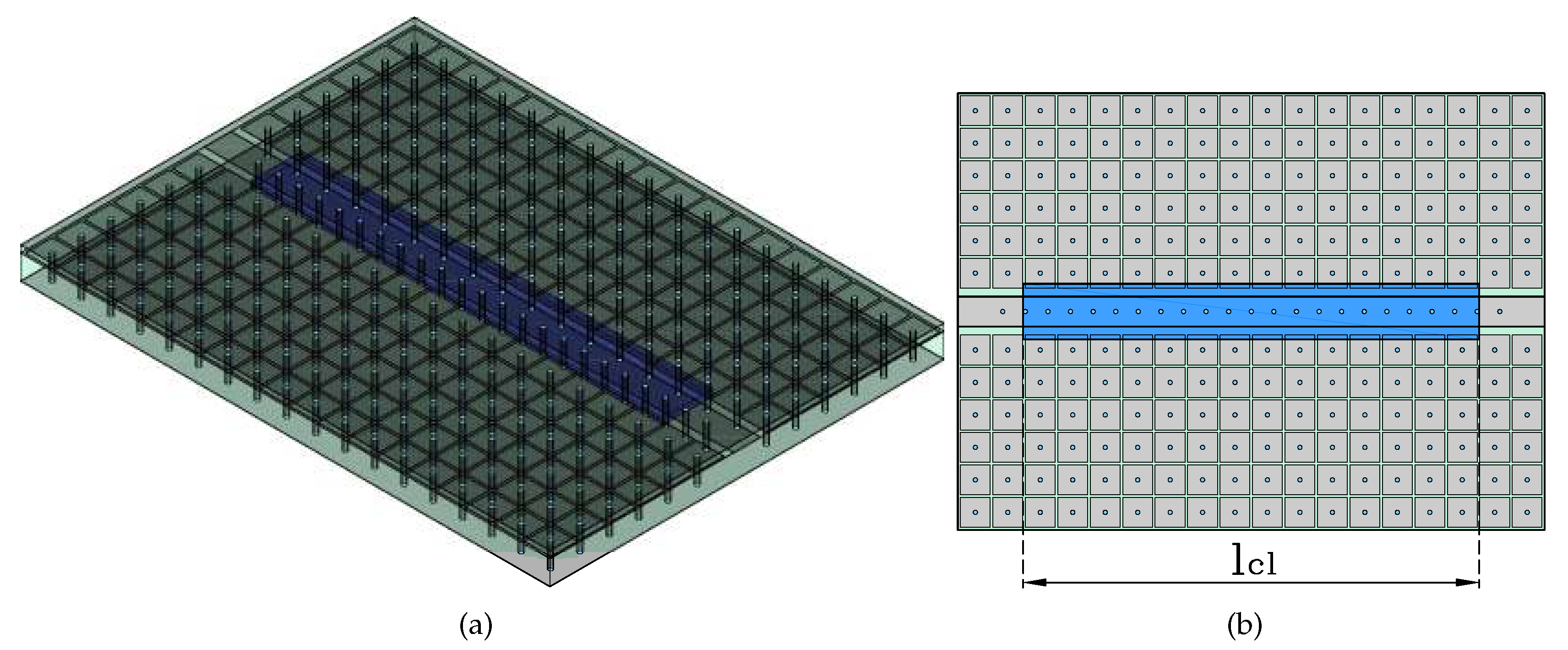 Figure 2. High impedance surface: (a) array of "mushroom" cells, (b) transversal cut of an array of "mushroom" cells.
