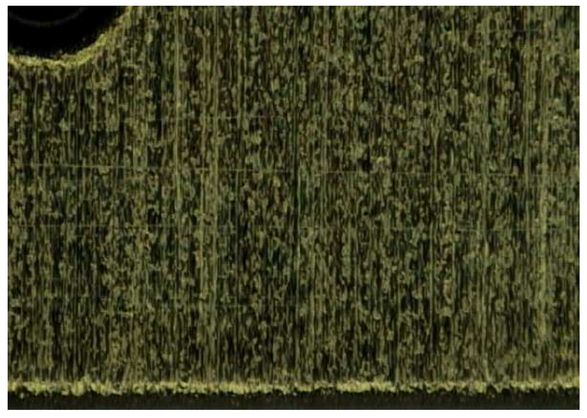 The PI is applied using a pipette onto the circuit and distributed via spin coating. Prior to this, a Kapton mask is used to prevent PI deposition on the “mushroom” bed. This procedure produces a uniform layer approximately 500 nm thick. The initial curing is performed at 80 °C for 20 minutes, followed by a second curing at 180 °C for 1 hour, next Kapton mask was removed by carefully cutting around the edges of the masking tape. As a result, the samples were covered and allowed to rest for a couple of hours and subsequently velvet rubbing was performed to create the microgrooves of the alignment layer. Finally, to ensure that the rubbing process has created grooves, a microscope was used to perform measurements. It is confirmed that fine microgrooves have been created on the alignment layer, as observed in Figure 8.