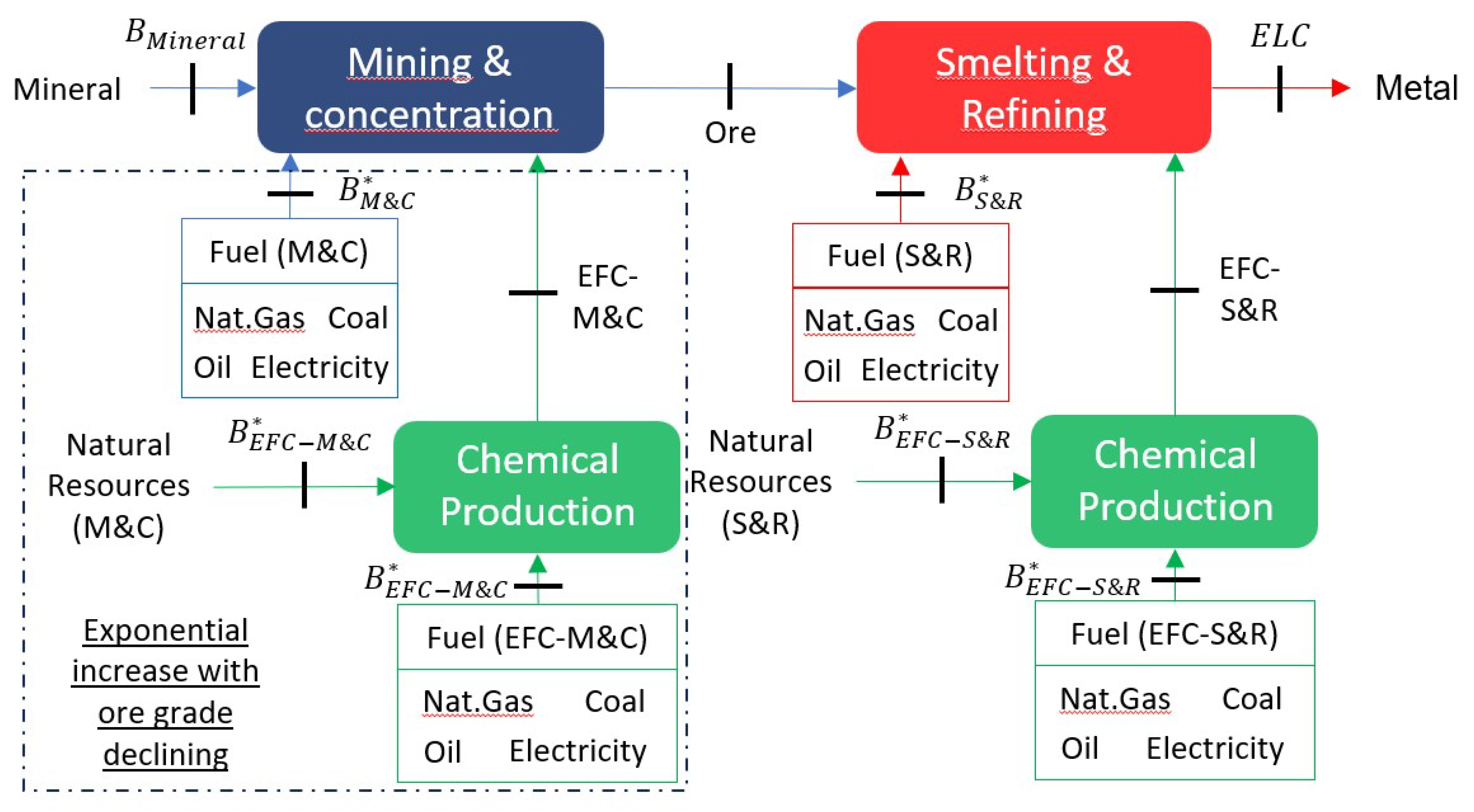 ) and all metals studied. It shows that implementing renewable energies in primary extraction would reduce the non-renewable exergy cost between 67% and 87%. Copper would be the metal with the lowest reduction due to the high chemical exergy of chalcopyrite that is destroyed in the production process. However, primary extraction would still require the extraction of natural resources from the mines, which would be depleted in the mining process, and their ore grade would decrease. Recycling would, therefore, save these resources for future generations. In addition, recycling, even with fossil technologies (