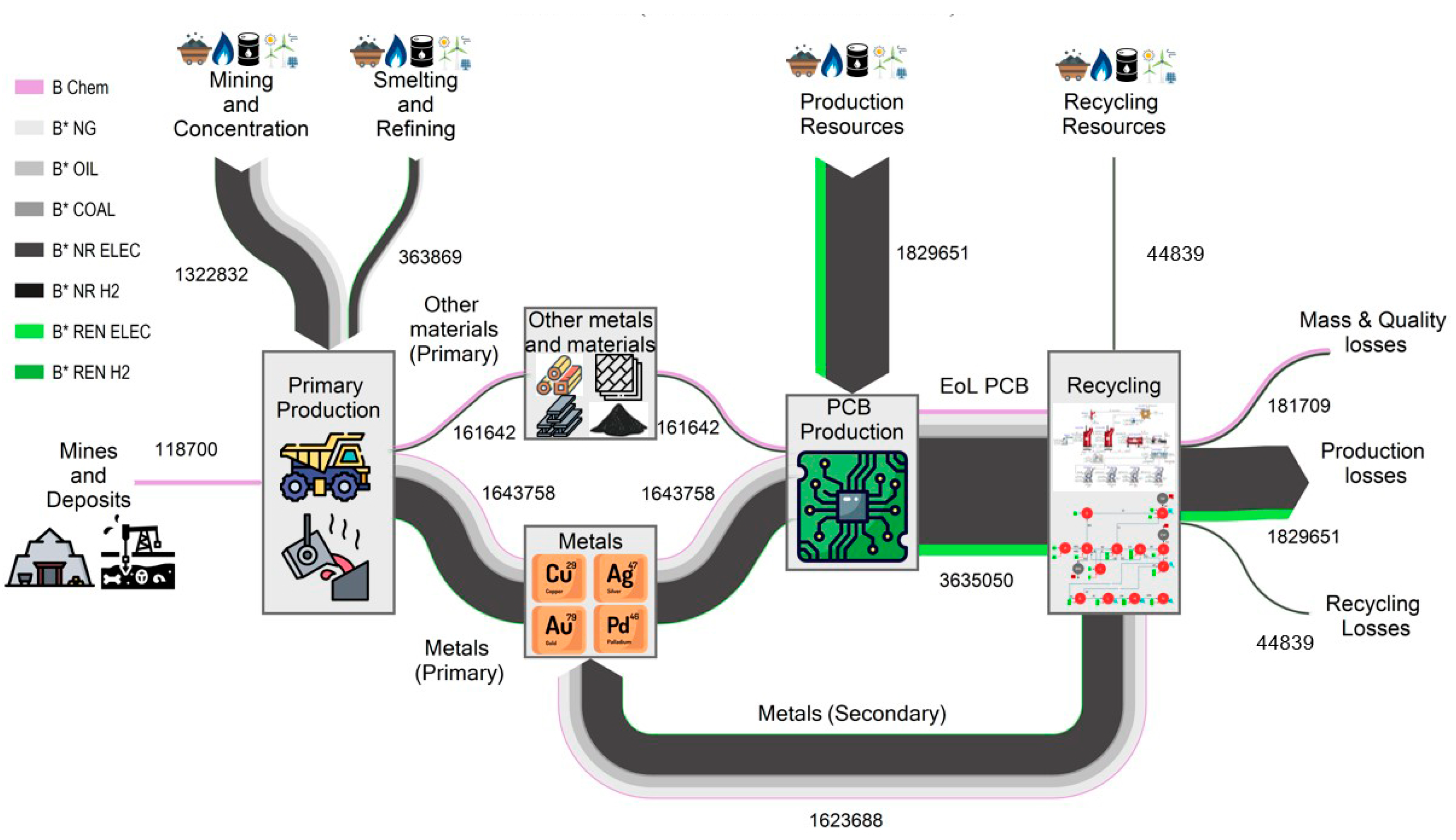 Figure 7 show two Sankey diagrams showing the complete life cycle of the metals and materials embedded in the PCBs, from their extraction in the mine to their recycling, through the exergy cost (measured in kWh). The exergy cost is divided into categories therefore we can differentiate between its non-renewable and renewable contributions.